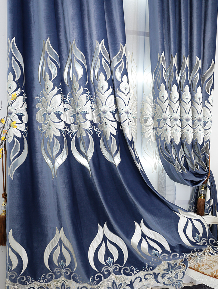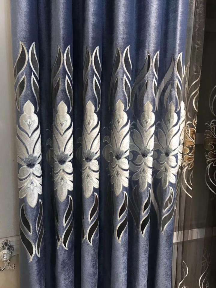 ผ้าม่านสีน้ำเงินทองขายดี ผ้าม่านปักลาย 100% โพลีเอสเตอร์
