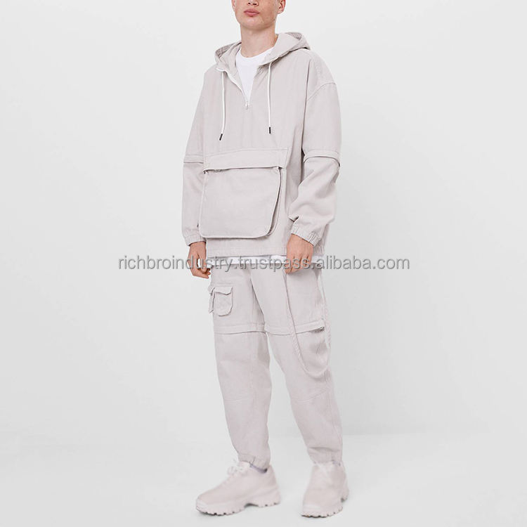 ชุดวอร์มผ้าฝ้าย100% 2ชิ้นแบบมีสไตล์ของผู้ชายชุดวอร์มโอเวอร์ไซส์ออกแบบได้เองมีรายละเอียดแบบถอดออกได้และโลโก้ด้านหน้า