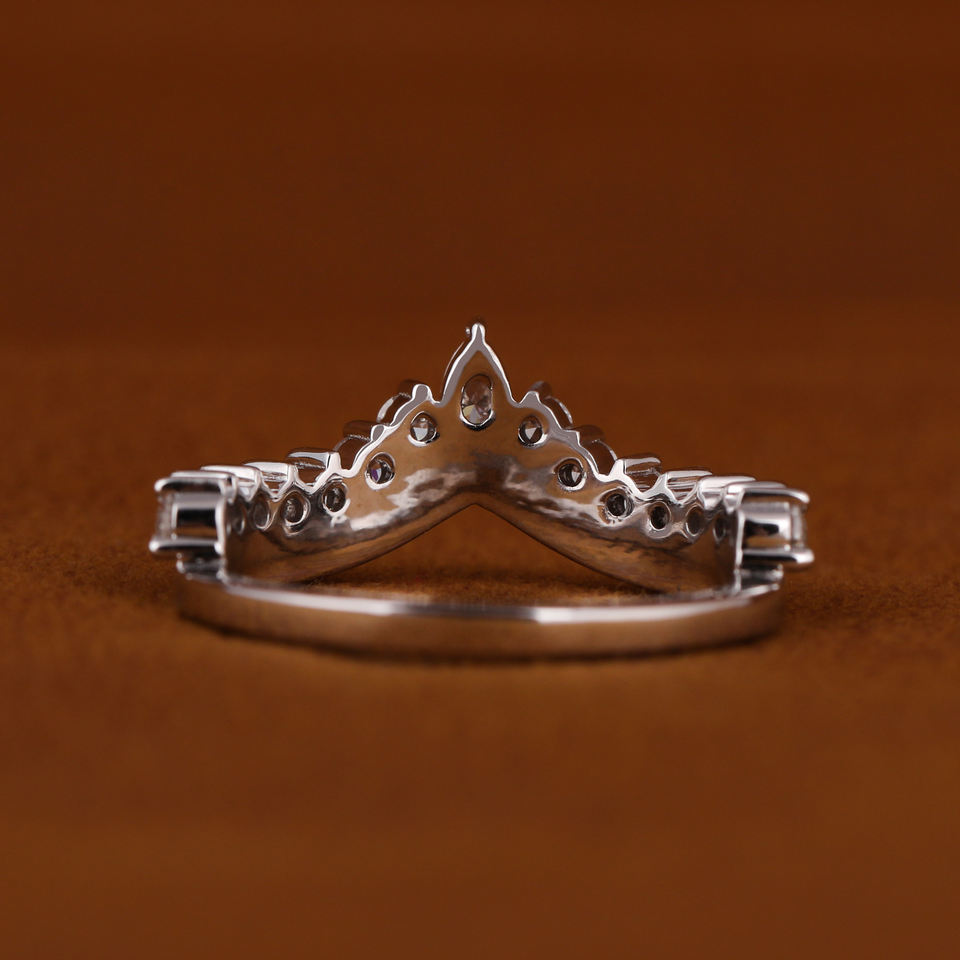 แหวนแต่งงานทองคำขาว 14k รูปมงกุฎ ประดับเพชรแล็บสี EF ระดับ VVS ดีไซน์โค้ง V แบบซ้อนได้ หรูหรา ขายดี