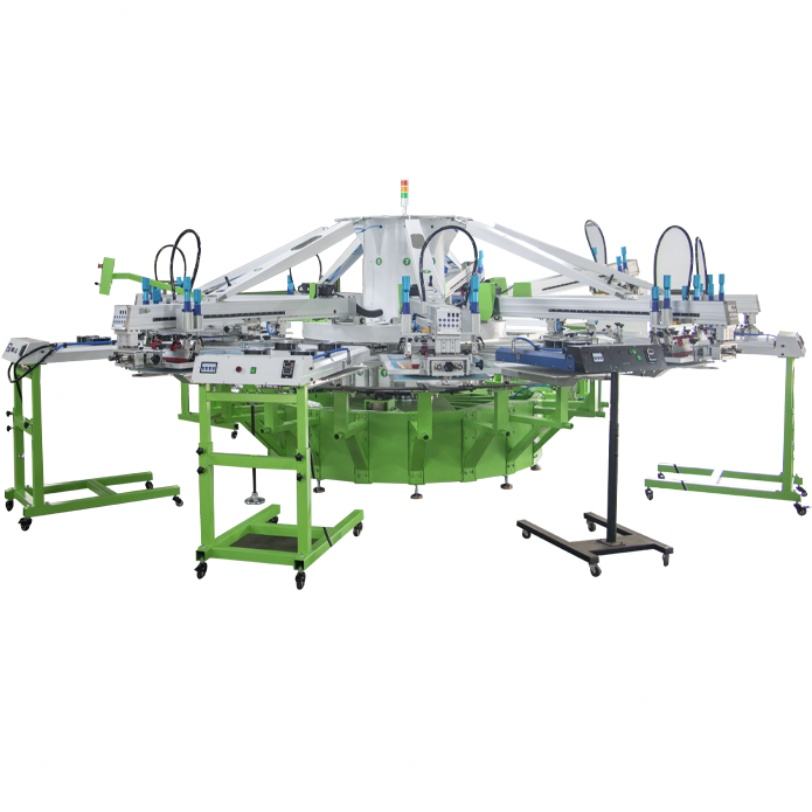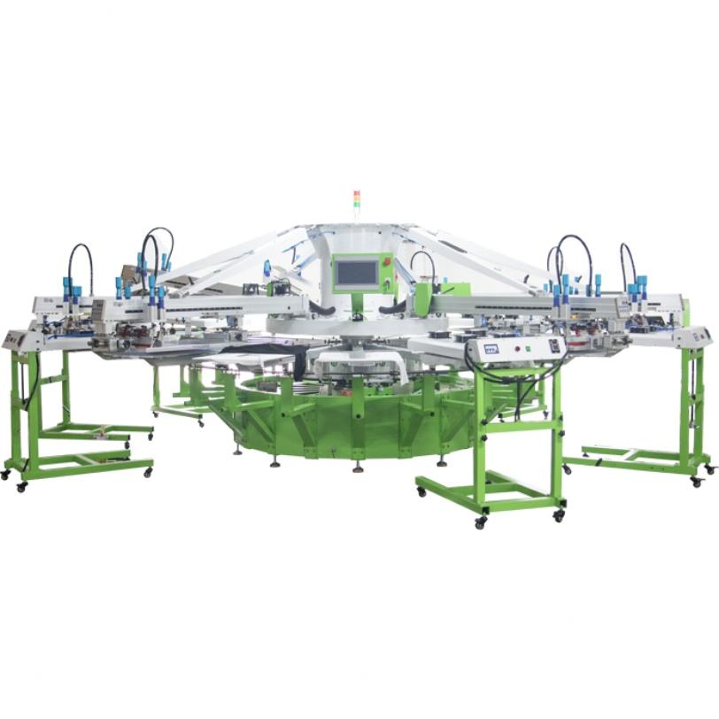 เครื่องพิมพ์สกรีนเสื้อผ้าแบบอัตโนมัติเต็มรูปแบบ 18 สถานี ยี่ห้อ Octopus ขายดี 8 สี สำหรับพิมพ์เสื้อยืด สภาพใหม่
