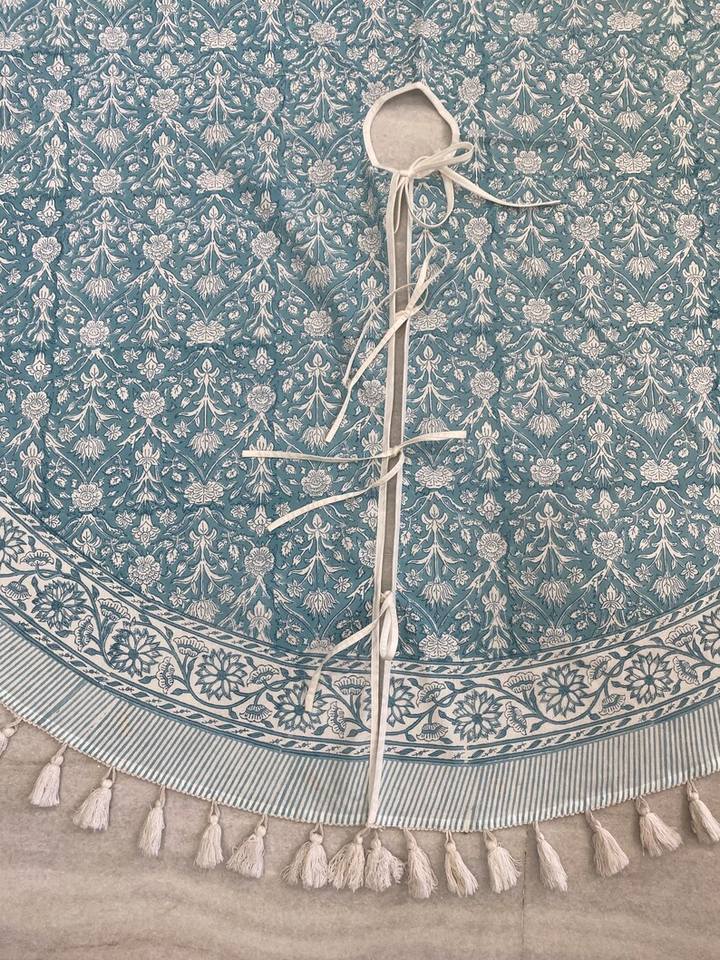 กระโปรงลายดอก2025สีนเป็ดอินเดียกระโปรงต้นคริสต์มาส100% พิมพ์ลายดอกไม้พร้อมพู่ปอมปอมบ้านไร่ตกแต่งกลางแจ้ง