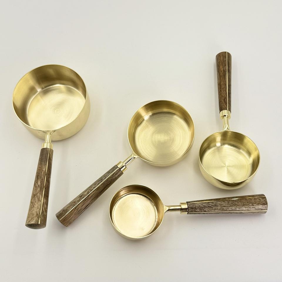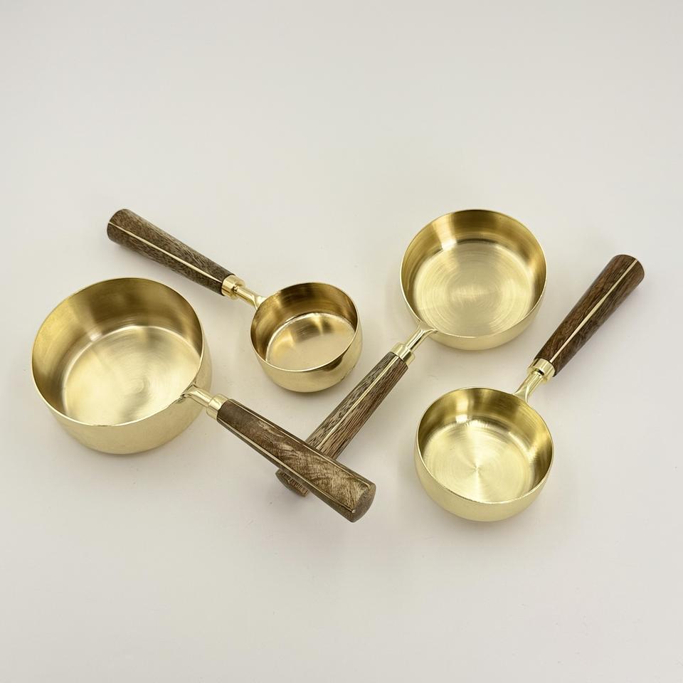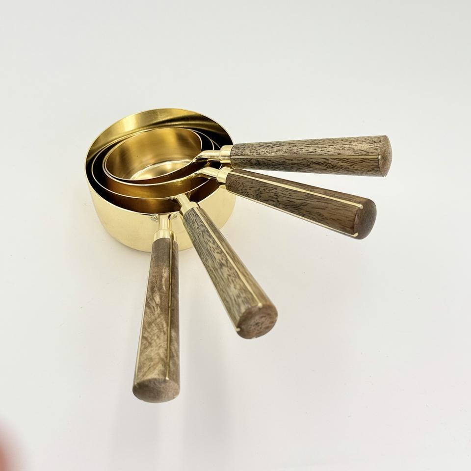 ชุดถ้วยตวงและช้อนตวงสแตนเลส 4 ชิ้น ขายดี พร้อมด้ามจับไม้เคลือบ PVD สีทอง สำหรับใช้ในบ้าน