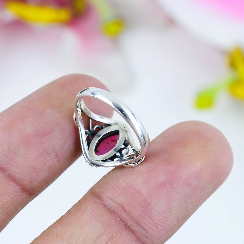 แหวนพลอยสีแดงทรงมาร์ควิส ดีไซน์ลายเกลียวเงิน | แหวนสไตล์วินเทจ เครื่องประดับหรูหรา ของขวัญสำหรับผู้หญิง