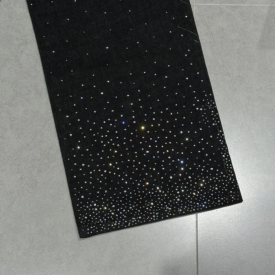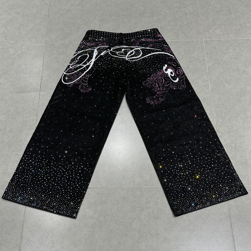 กางเกงขายาวทรงแบ็กกี้ ดีไซน์ดั้งเดิม คุณภาพสูง ผลิตโดยผู้ผลิต OEM เสื้อผ้าสตรีทแวร์ ประดับคริสตัลสีดำ กางเกงแบ็กกี้ประดับคริสตัล