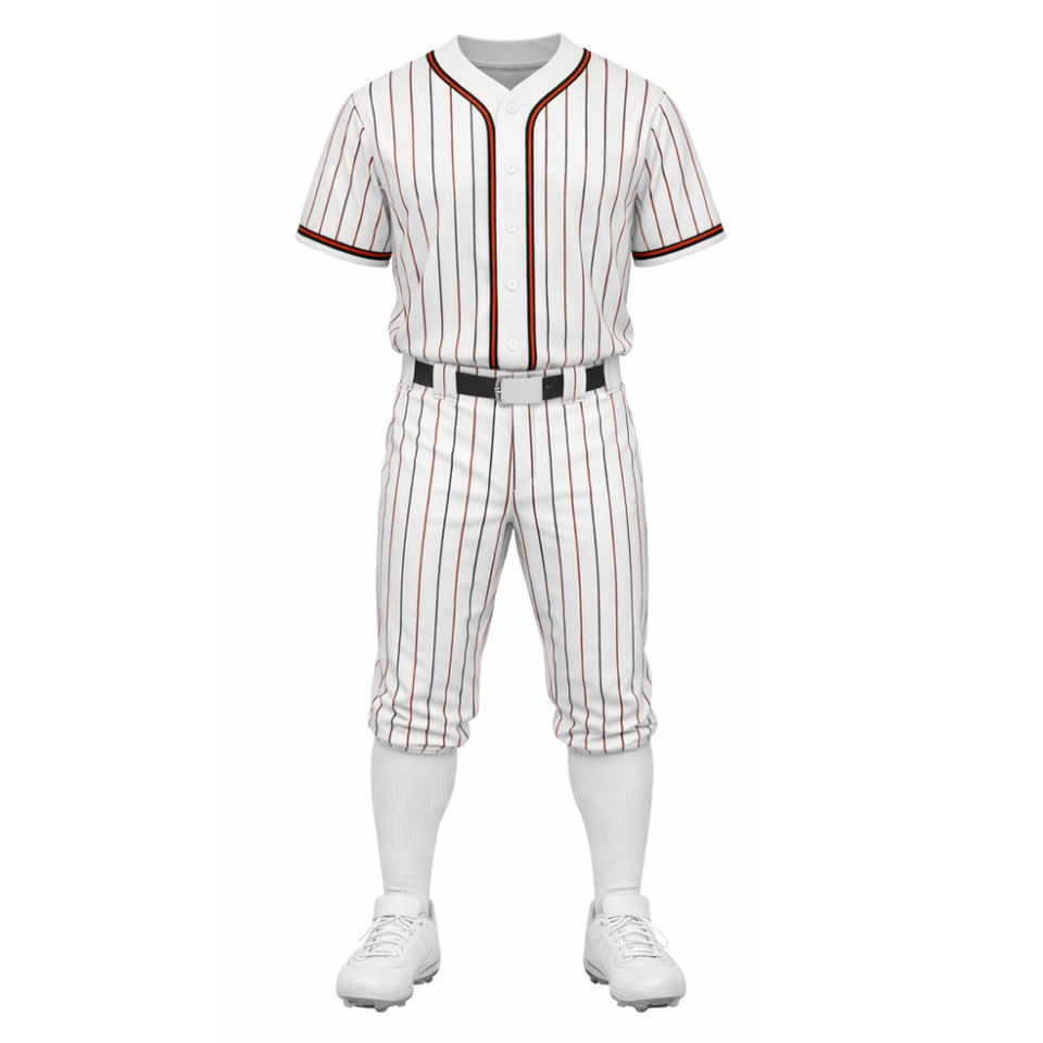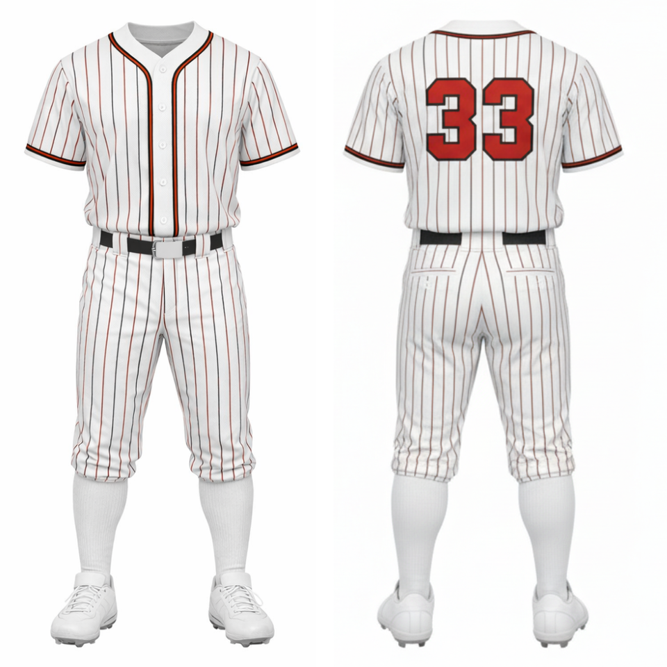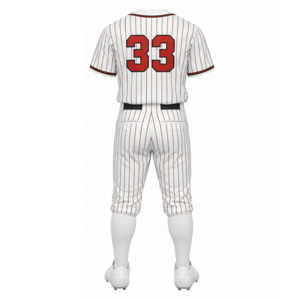 ชุดยูนิฟอร์มเบสบอลขายดี | เสื้อเจอร์ซีย์และกางเกงลายทางสีขาวและสีแดงแบบซับลิเมชั่น