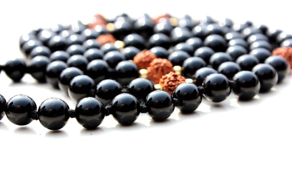 ร้อนขายสีดํานิลรุทธรกษา 108 ลูกปัดผูกปมสร้อยคอMala Handmadeศิลปินอินเดียสร้อยคอลูกปัด