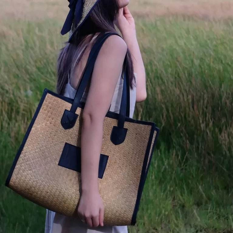 โบฮีเมียนจากฟางกระเป๋าโท้ทจากหญ้าทะเลพร้อมซับในทำจากผ้าฝ้ายสำหรับการเดินทางขายส่งกระเป๋าชายหาด MHBG3เวียดนาม