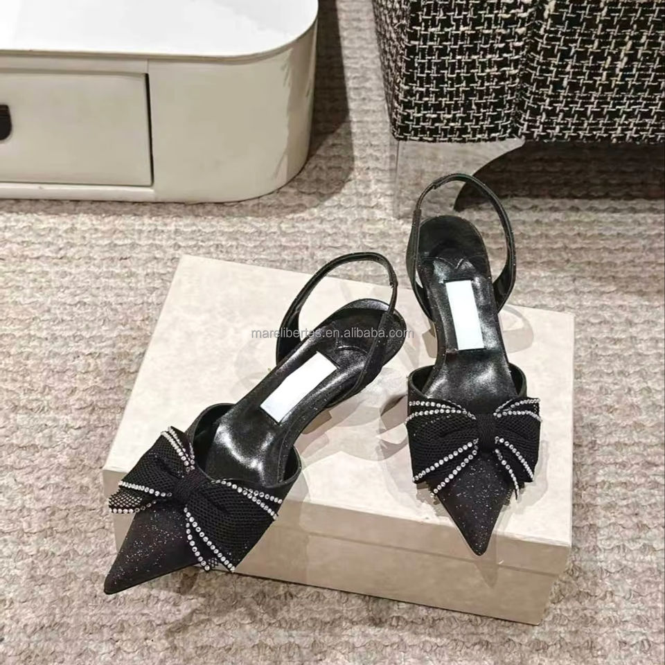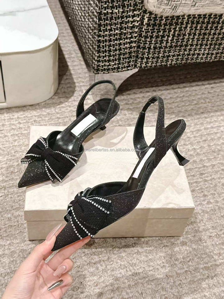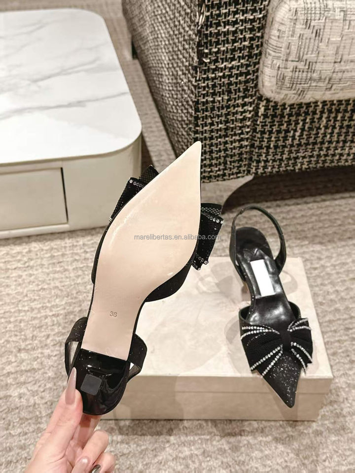 รองเท้าส้นเข็มแบบสวม ยี่ห้อ JimmysChoos รุ่น Bowknot Cat Eye Verity ดีไซน์แบรนด์ดัง ขายดี ประดับคริสตัล นำเข้า หนังแท้