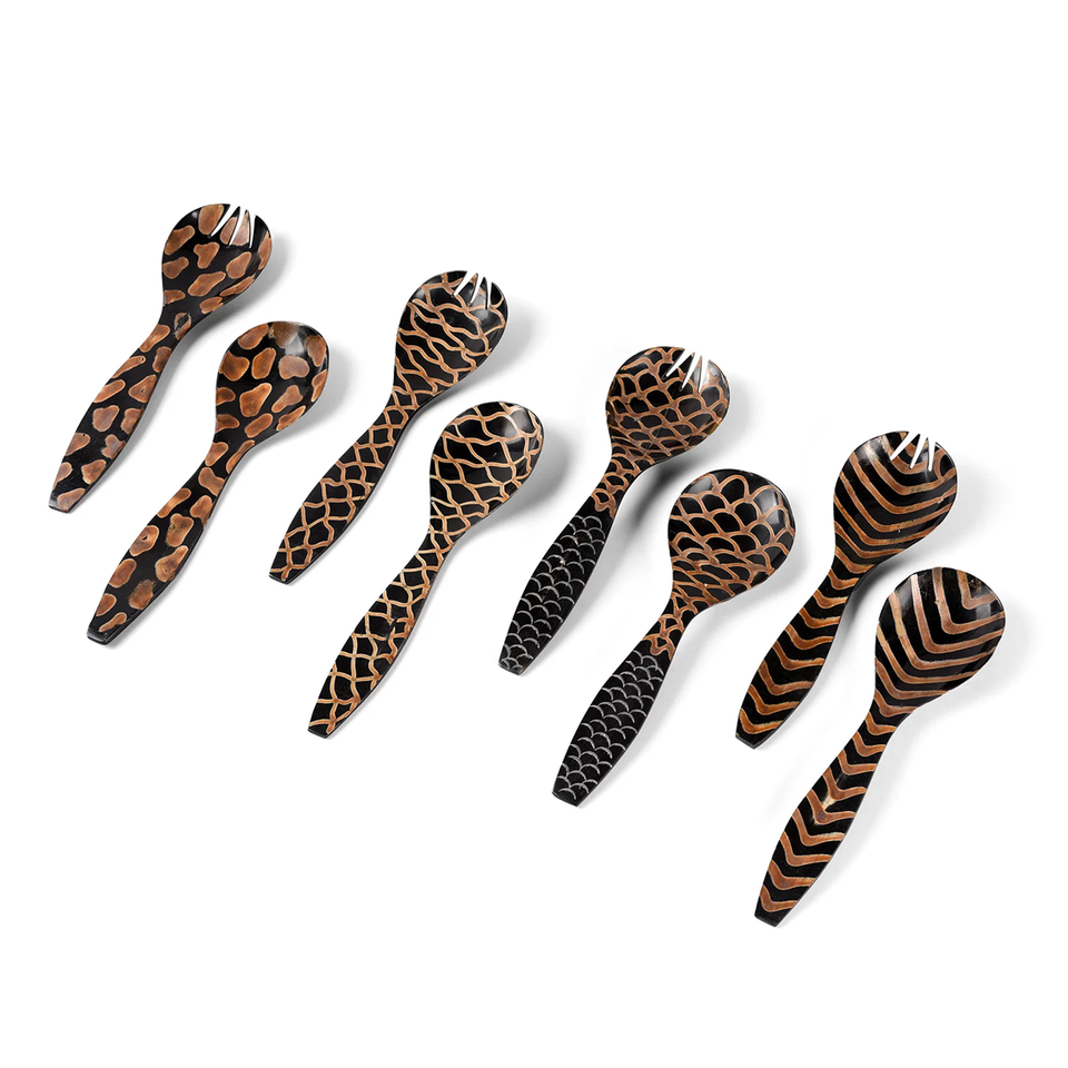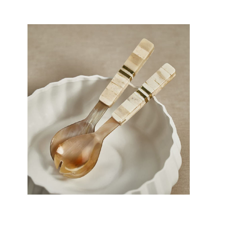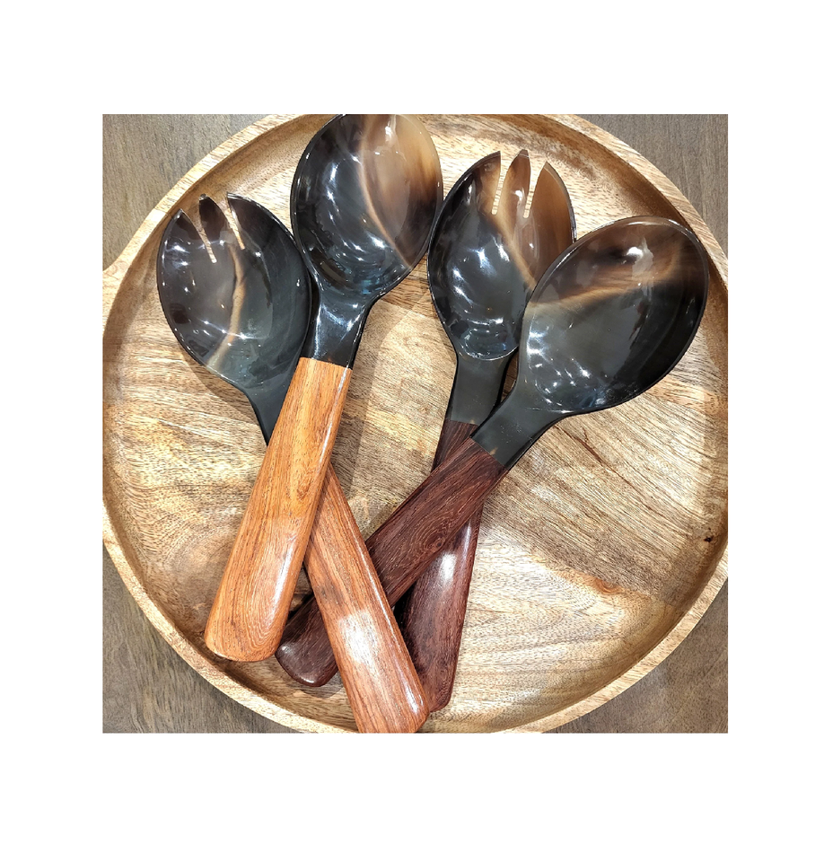 ชุดเสิร์ฟสลัดควายฮอร์นพร้อมด้ามจับเหล็กสำหรับสลัดบาร์เสิร์ฟชุดช้อนและส้อมสินค้าล่าสุด
