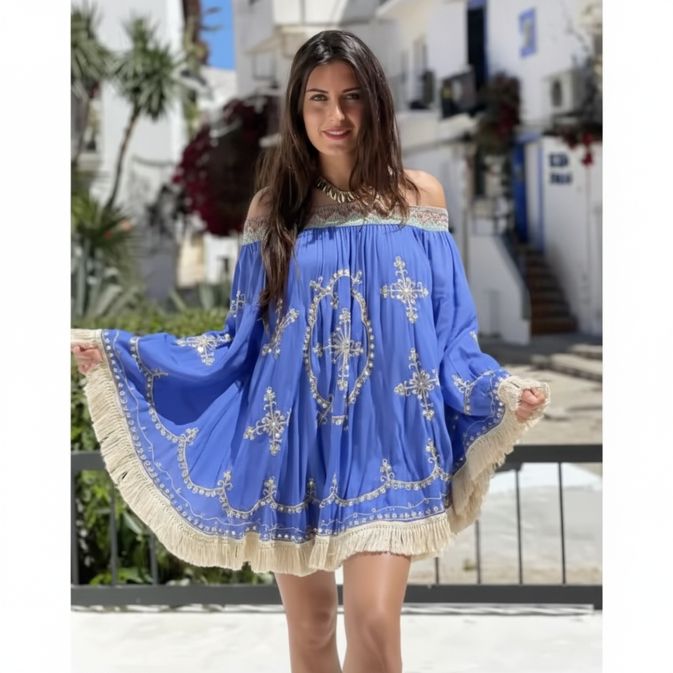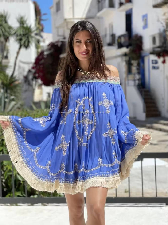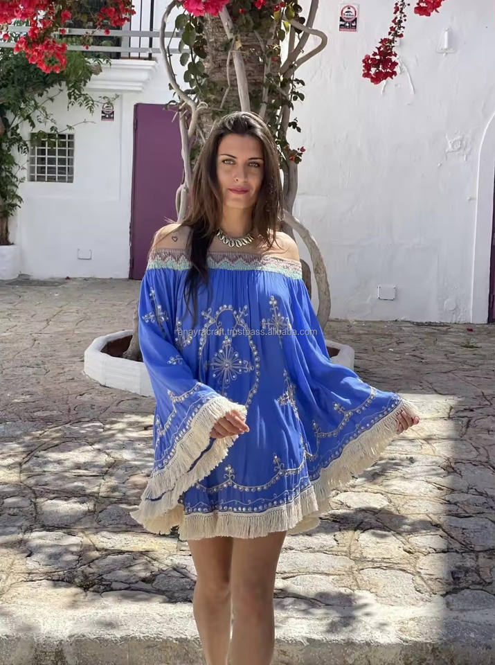 ชุดเดรสลำลองสไตล์โบฮีเมียนสำหรับผู้หญิงเดรสสั้นแขนบานพร้อมลูกไม้ปักลายเซ็กซี่ชุดทำงานสำหรับเด็กผู้หญิง