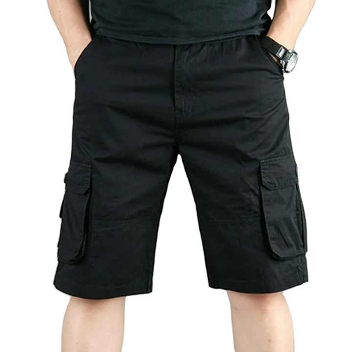 กางเกงขาสั้นคาร์โก้ของผู้ชายผ้าฝ้าย100% ลำลองมีกระเป๋าหลายช่องระบายอากาศได้ดีแห้งเร็วสีดำทึบ