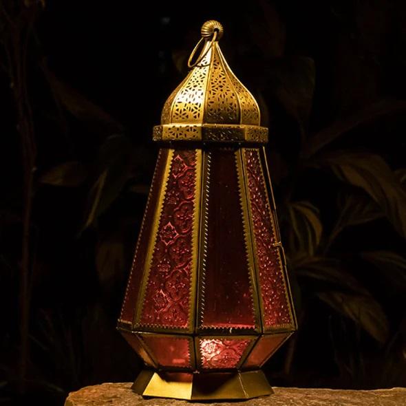 โคมไฟทองเหลืองโบราณคลาสสิกขายดีพร้อมแก้วรูปทรงเรขาคณิตของโมร็อกโกตกแต่งกลางแจ้งที่วางเทียนและขวดโหลทำด้วยมือ