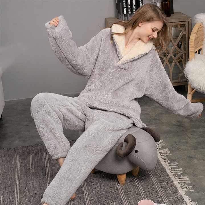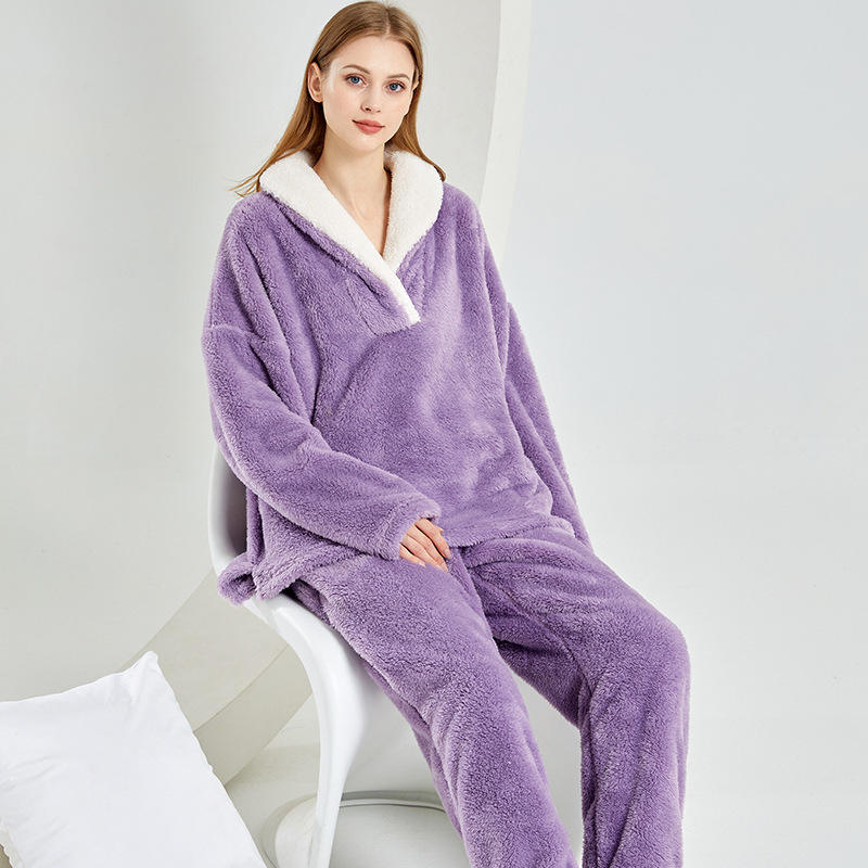 ชุดนอนผ้ากำมะหยี่คอรัลระบายอากาศดีไซน์ไซส์ใหญ่สำหรับผู้หญิง ชุดนอนฤดูหนาวพร้อมกางเกงผ้าฟลานเนล ขายดี