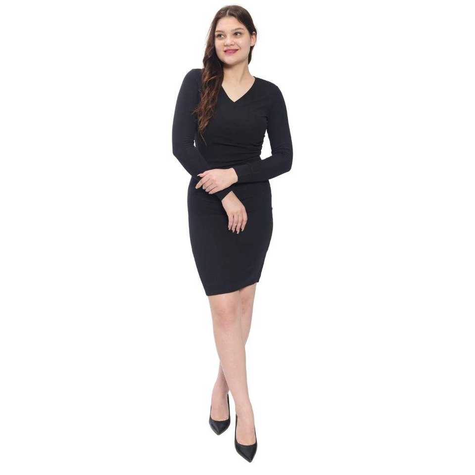 ชุดเดรสยาวเหนือเข่าสำหรับผู้หญิงชุดเดรสผ้าฝ้ายผสมทรงเข้ารูปคอวี