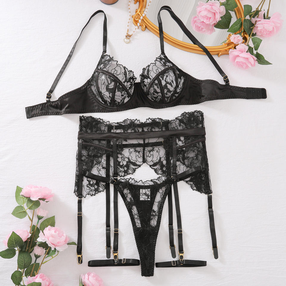 ชุดชั้นในลูกไม้ปักลายสไตล์ยุโรปและอเมริกาสุดเซ็กซี่แบบซีทรู กระชับรูปร่าง ชุดสี่ชิ้น ขายดีข้ามพรมแดน
