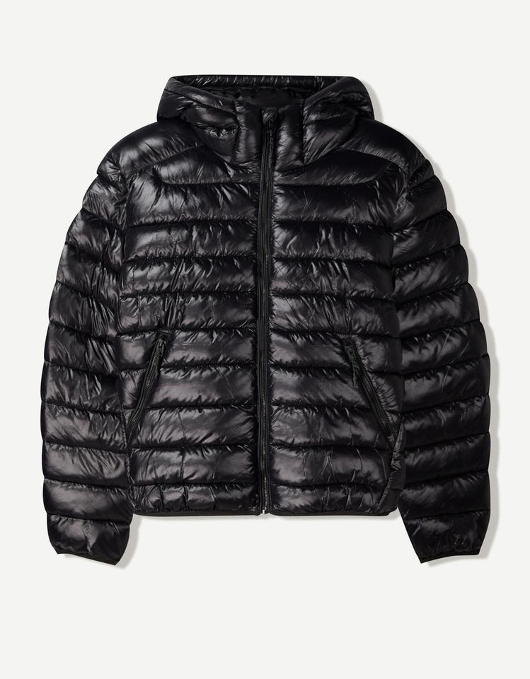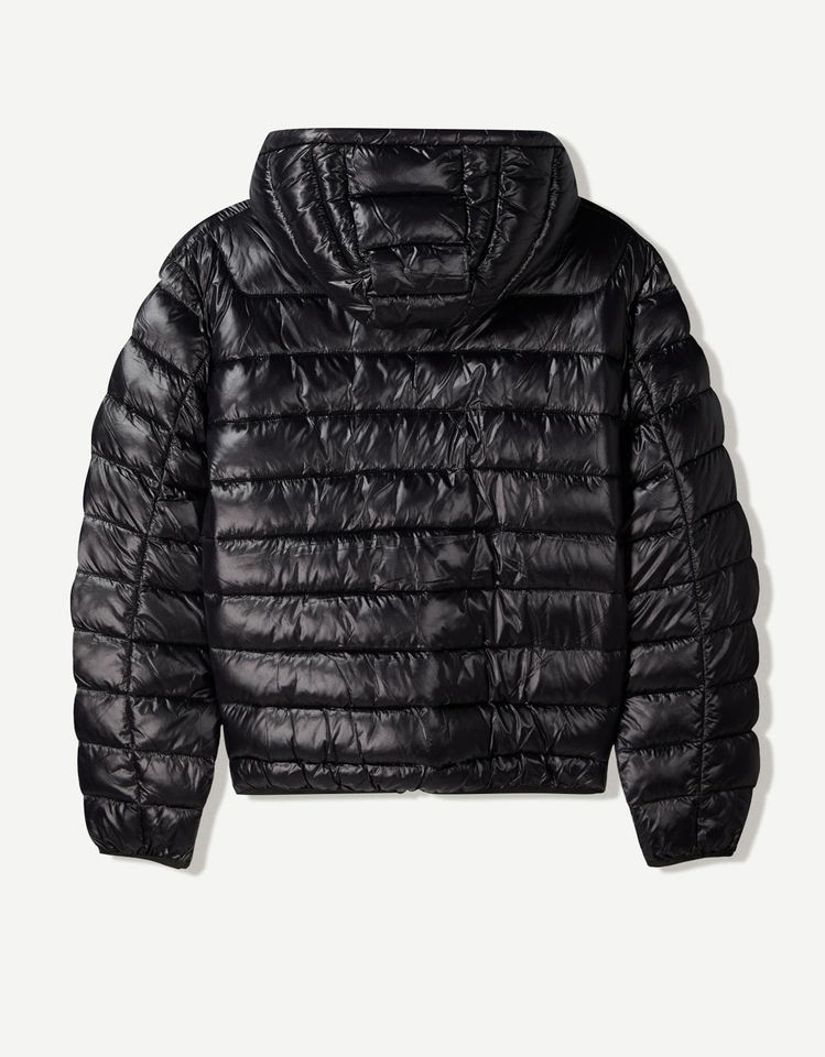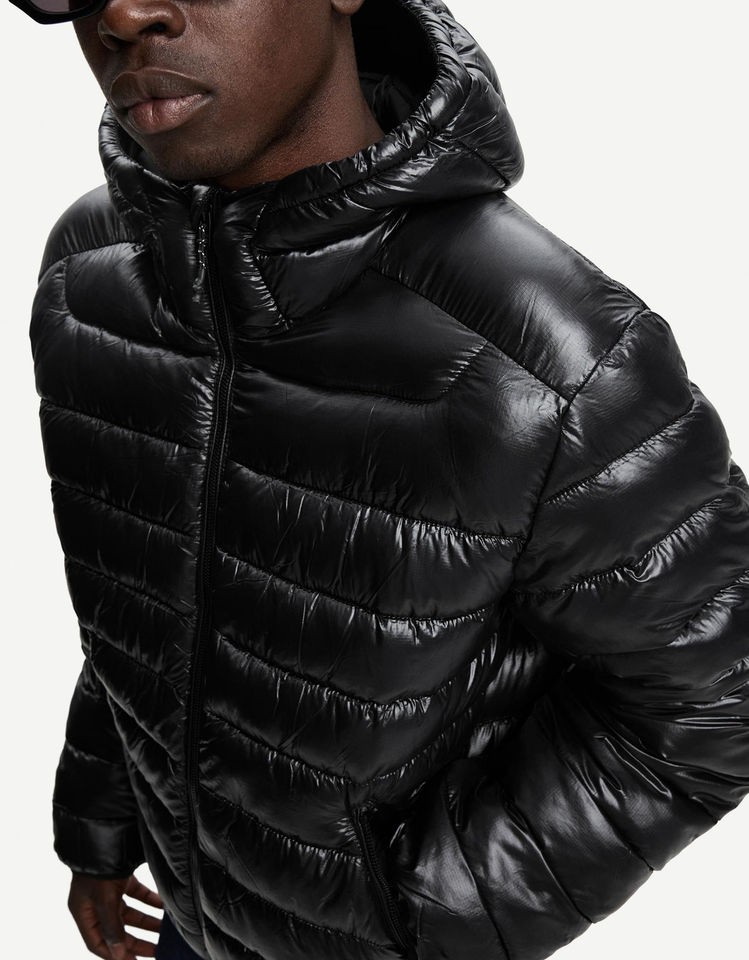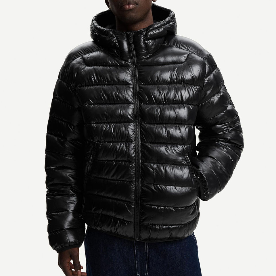 แจ็กเก็ตขนเป็ดสีดำของผู้ชายเสื้อแจ็คเก็ตบุนวมมีฮู้ดผ้าโพลีเอสเตอร์100% น้ำหนักเบาดีไซน์แบบกำหนดเอง
