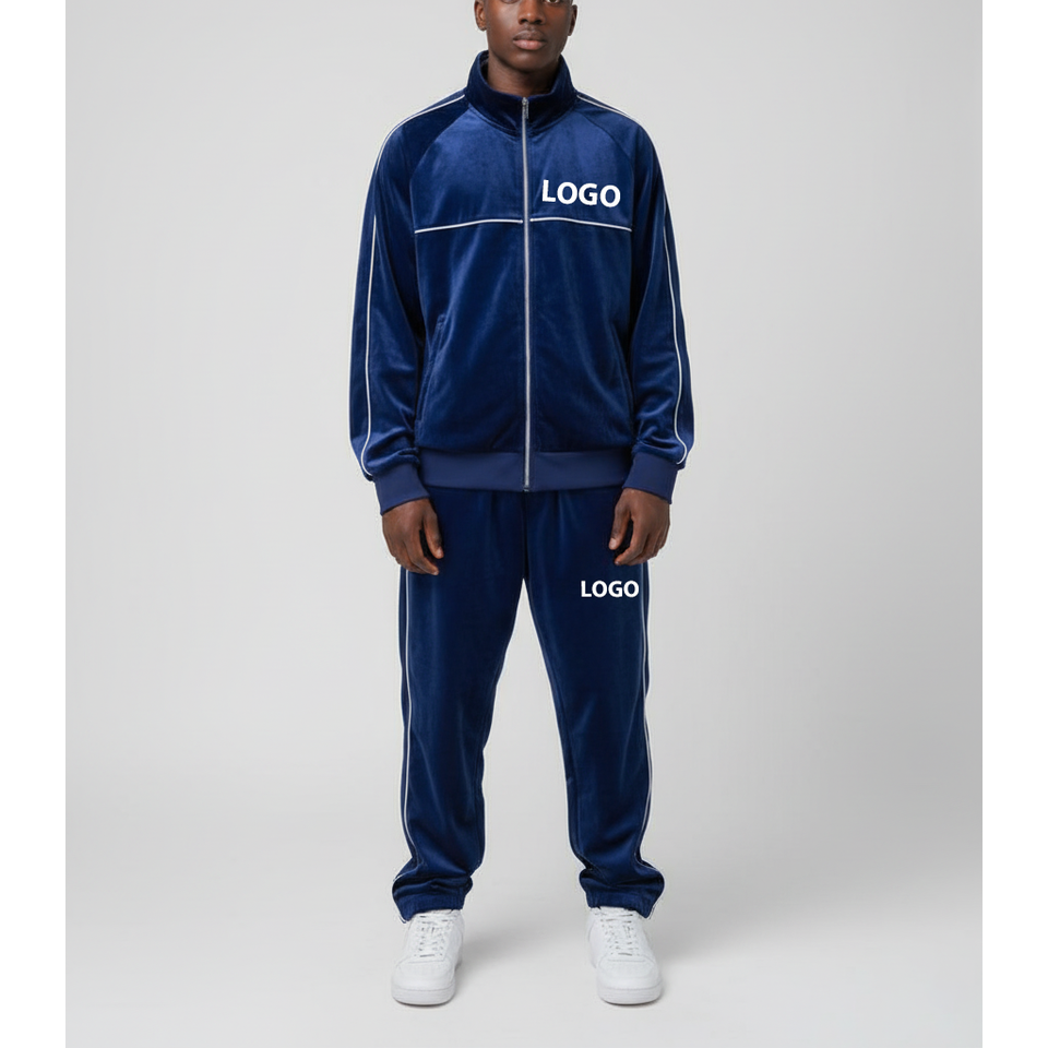 ชุดวอร์มผู้ชายผ้ากำมะหยี่สีน้ำเงิน ดีไซน์สั่งทำพิเศษ ระบายอากาศได้ดี ขายดี พร้อมบริการพิมพ์โลโก้ OEM ดีไซน์ซับในสีขาว ชุดกำมะหยี่ฤดูหนาวแบบ 2 ชิ้น