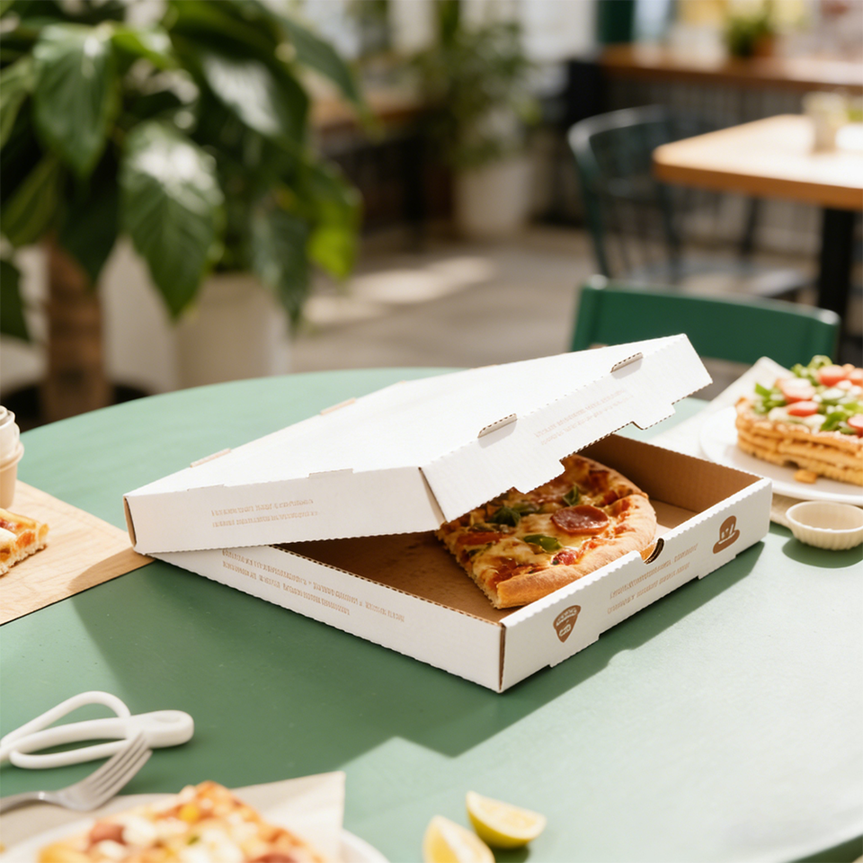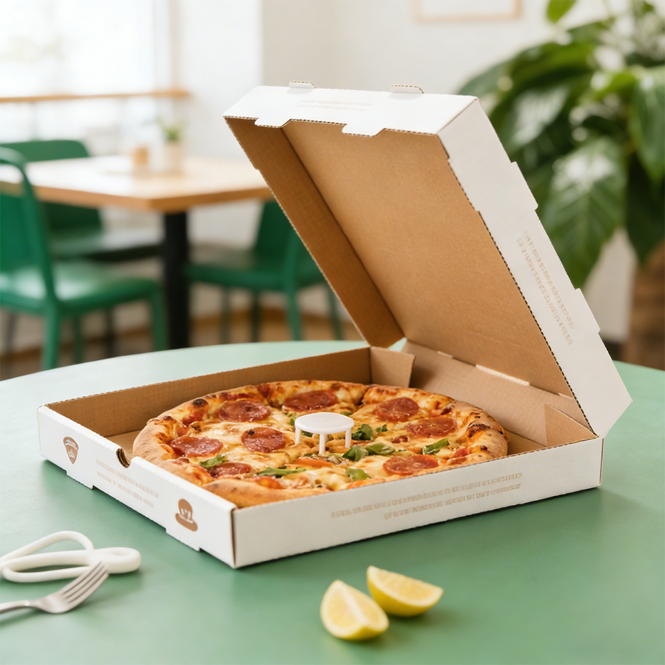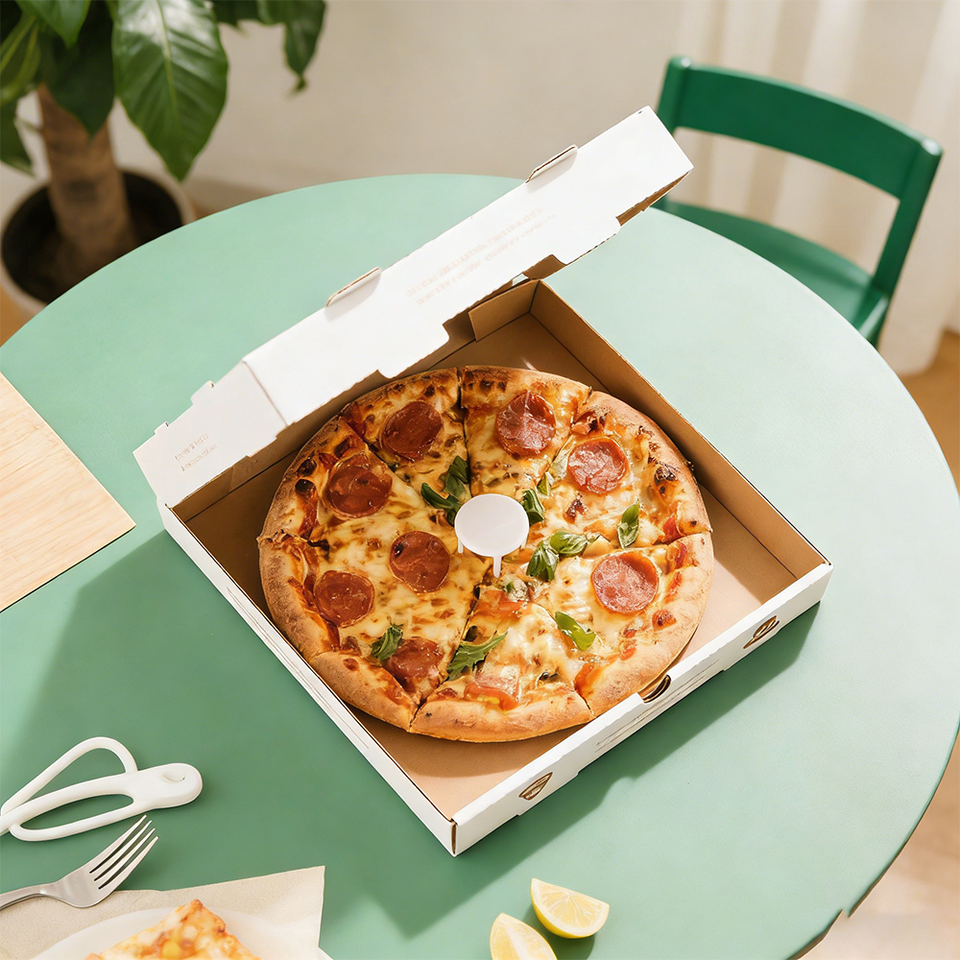 กล่องพิซซ่าลูกฟูก E-Flute แบบกำหนดเอง ขายดี ขนาด 10-16 นิ้ว ผลิตจากกระดาษรักษ์โลก เคลือบ UV สำหรับใส่อาหารกลับบ้าน