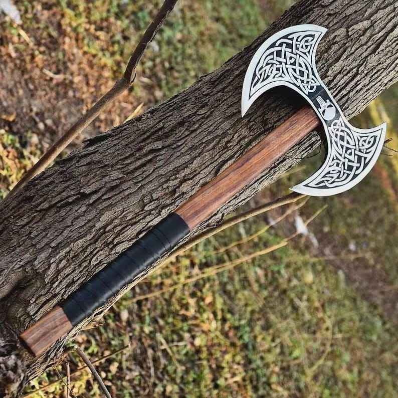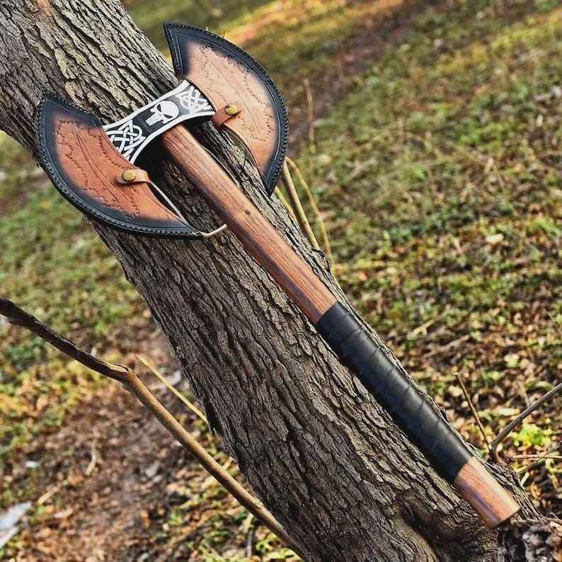ขวานไวกิ้งสองคม งานแฮนด์เมดสั่งทำพิเศษ ขายดี ผลิตจากเหล็กกล้าคาร์บอนสูง ขวานต่อสู้แบบสองคม พร้อมปลอกหนัง