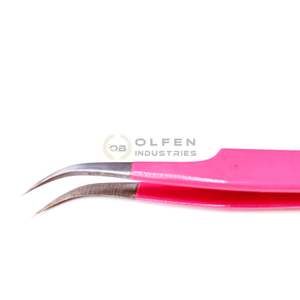 แหนบต่อขนตาสแตนเลสสีชมพูแบบปรับแต่งได้คุณสมบัติการพิมพ์คิ้วแหลมปริมาณโค้ง