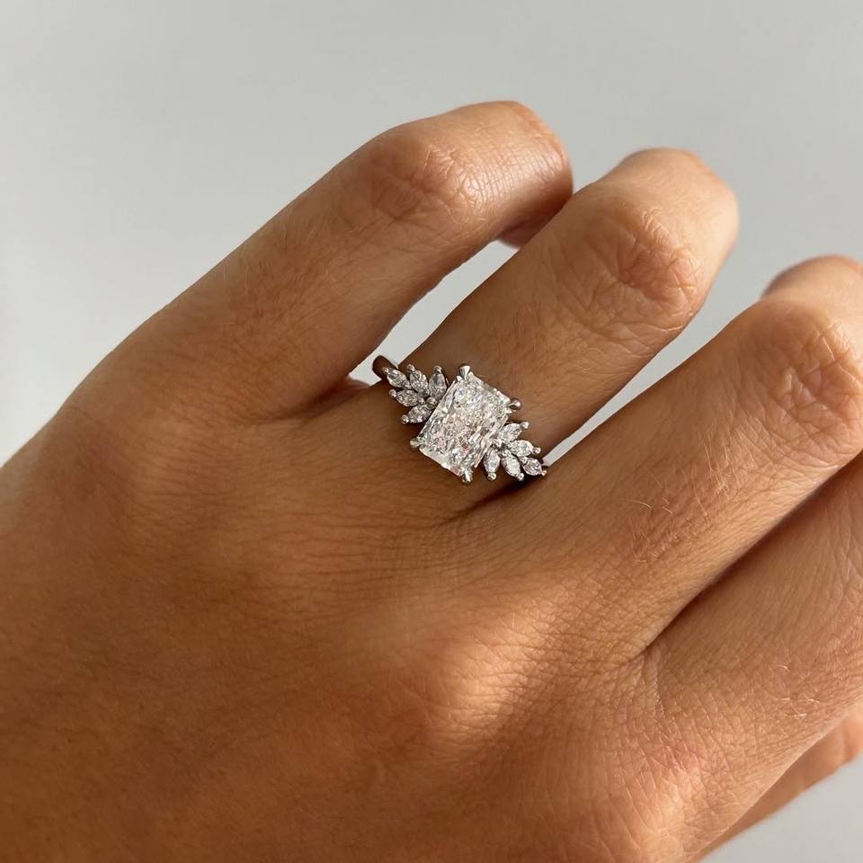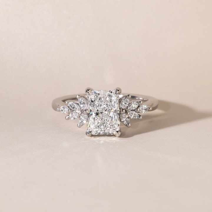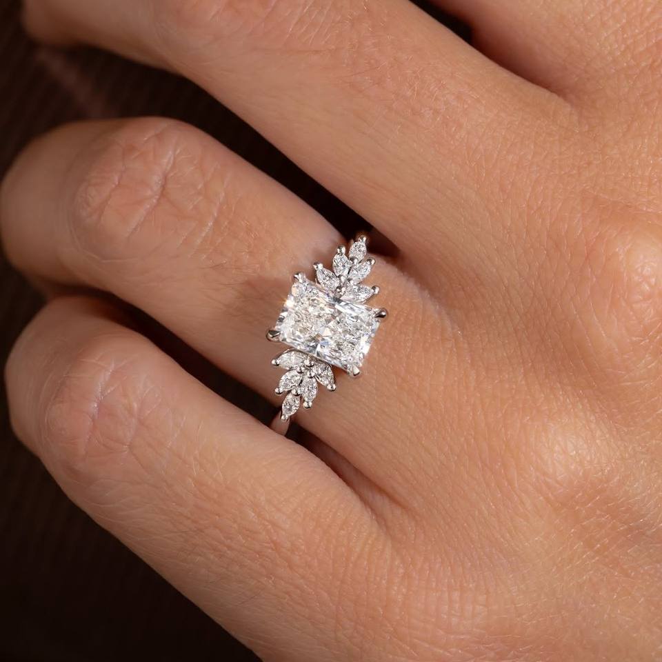 แหวนเพชรทรงรัศมีประดับดอกไม้ด้านข้าง เพชรเลี้ยงในห้องปฏิบัติการ ทอง 10K 14K 18K หรูหรา สำหรับงานหมั้น งานแต่งงาน ของขวัญวันครบรอบ เครื่องประดับ