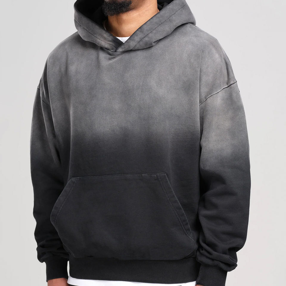 เสื้อฮู้ดดี้ผู้ชายผ้าฟลีซคอตตอน 100% สีดำฟอกแบบวินเทจ ดีไซน์ระบายอากาศได้ดี ขอบแขนและชายเสื้อแบบริบ รับสกรีนโลโก้ตามแบบ ขายดี