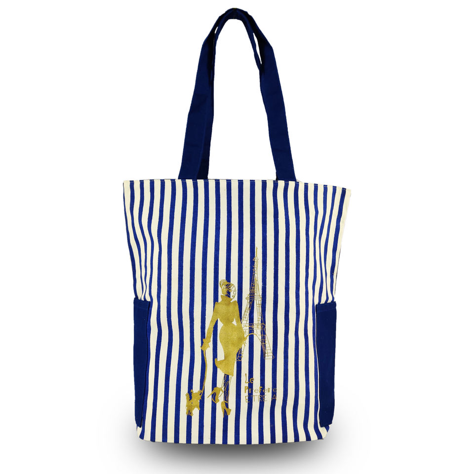 ถุงผ้าแคนวาสลายแถบแบบสั่งทำมีกระเป๋า2ด้านพิมพ์สีทองสำหรับใช้ในการช้อปปิ้งและร้านขายของชำ