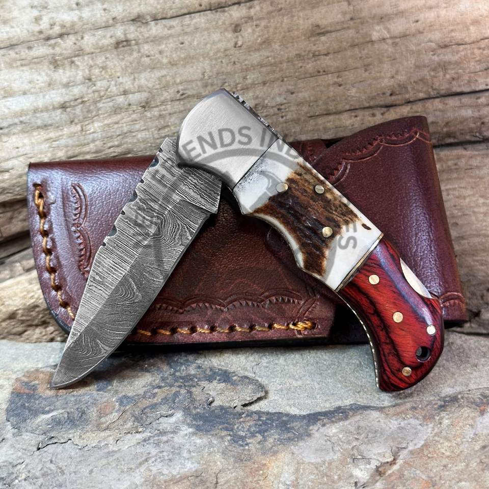 มีดพับพกพาเหล็กดามัสกัสทำมือปรับแต่งได้ตามต้องการใช้กลางแจ้งเขากวางเขากวางเขากวางไม้สีแดง