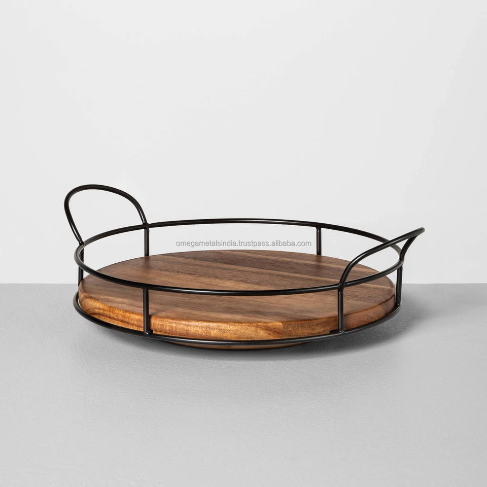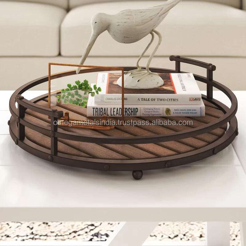 ขายร้อนตกแต่งไม้ถาดที่มีด้ามจับเหล็กและเคลือบสีดำสำหรับตกแต่งโต๊ะและตกแต่งบ้าน