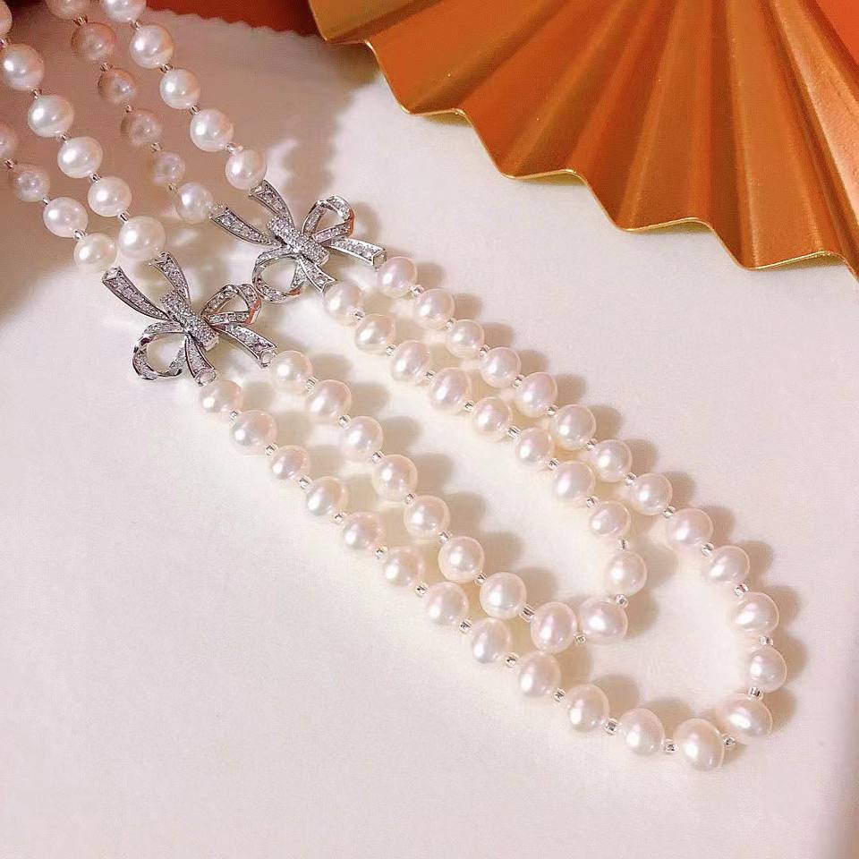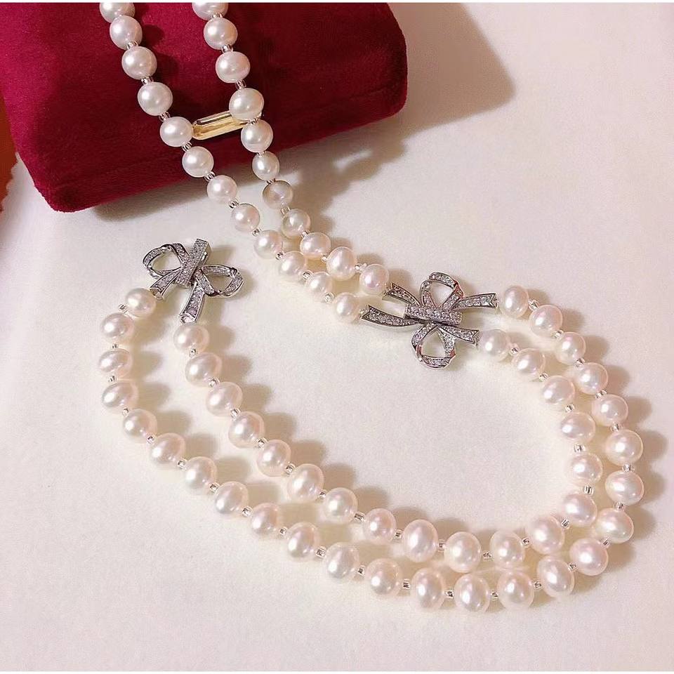 สร้อยคอมุกน้ำจืดทรงเกือบกลม ขนาด 7-8 มม. สองชั้น ขายดี พร้อมจี้รูปผีเสื้อ เครื่องประดับ