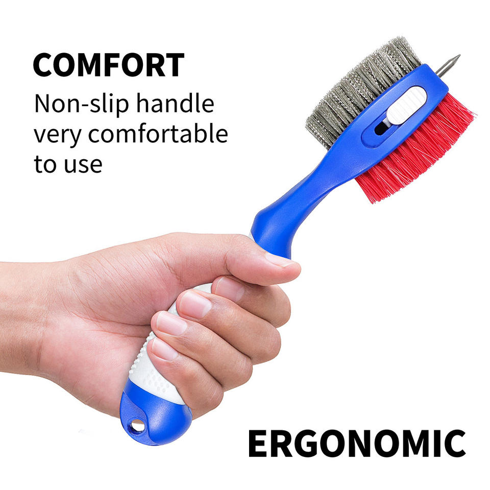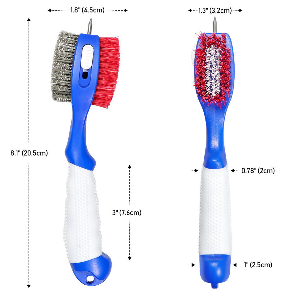 แปรงทำความสะอาดไม้กอล์ฟแบบแม่เหล็กสองด้านพร้อมขนแปรงไนลอนเหล็ก สีน้ำเงิน/แดง