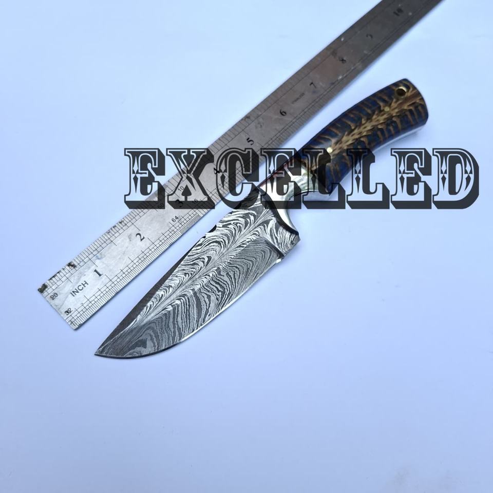 มีดสกินเนอร์เหล็กลายขนนกมีดล่าสัตว์และเอาชีวิตรอดพร้อมที่จับโคนต้นสน