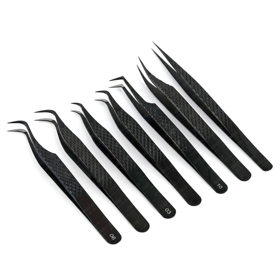 แหนบต่อขนตาปลอมปลายตะขอปลายขนตาแบบไฮบริดแหนบปลายแหลมสีดำทำจากสเตนเลสสตีล