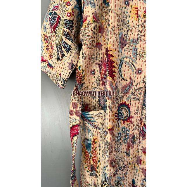เสื้อคลุมกิโมโนพิมพ์ลายดอกไม้ขายดีเสื้อแจ็กเก็ต Kantha ยาวถึงเข่าและแขนยาวสไตล์ชีวิตประจำวันที่สวยงาม