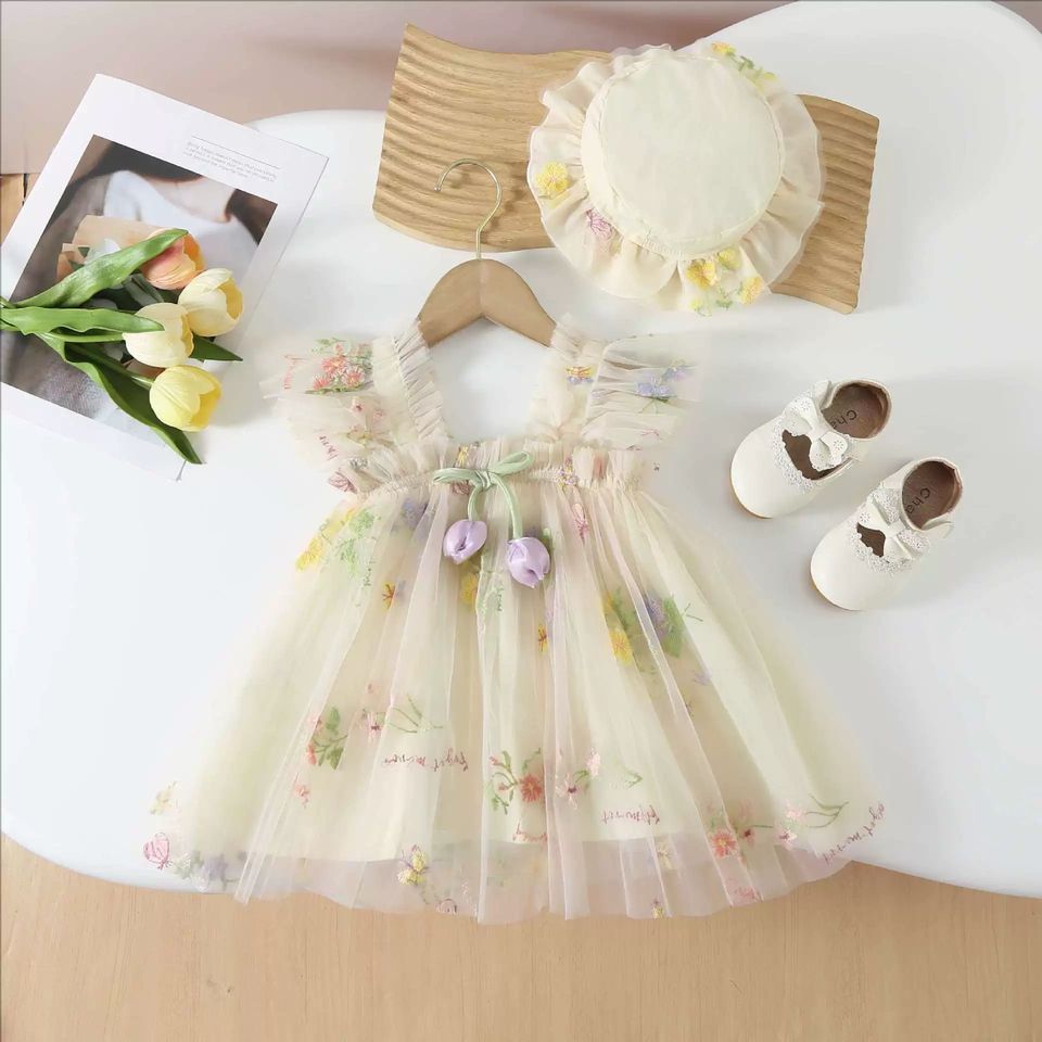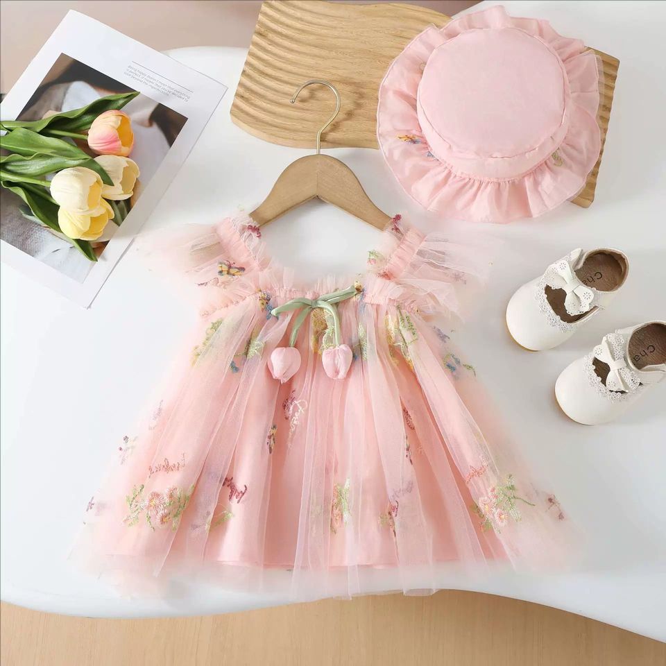 ชุดเดรสเด็กผู้หญิงปักลายดอกไม้ขายดี พร้อมหมวก ชุดเดรสสม็อคสำหรับเด็กผู้หญิง