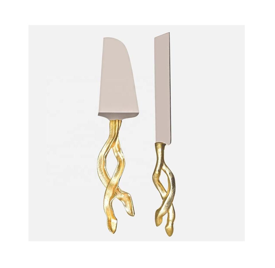 ชุดมีดตัดและเสิร์ฟเค้กโลหะมีดตัดเค้กด้ามชุบทอง
