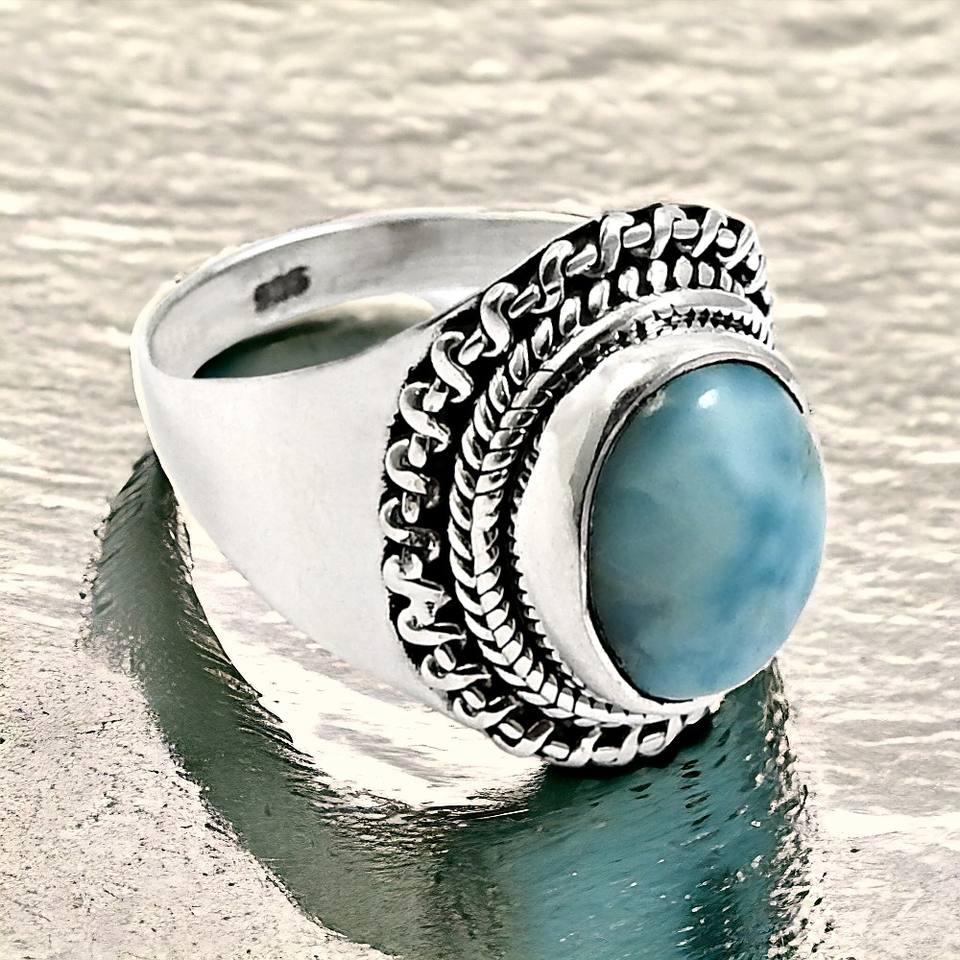 ขายร้อนคุณภาพดี 925 เงินสเตอร์ลิงธรรมชาติ Larimar อัญมณีรูปไข่แหวนออกแบบสั่งทําพิเศษผู้ผลิตเครื่องประดับ