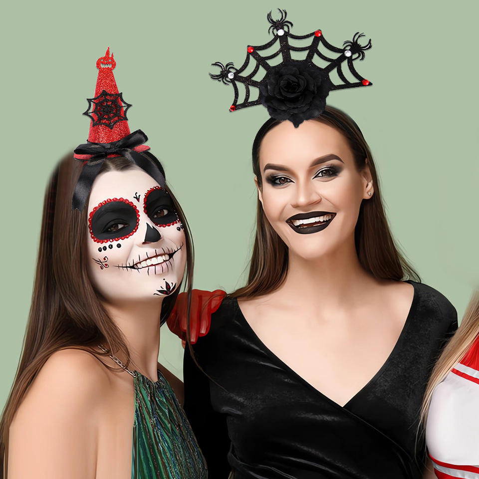 หมวกแม่มดฮาโลวีนแบบคาดศีรษะแบบใหม่สำหรับเทศกาลผีตกแต่งงานปาร์ตี้เต้นรำพร้อมหัวเข็มขัด