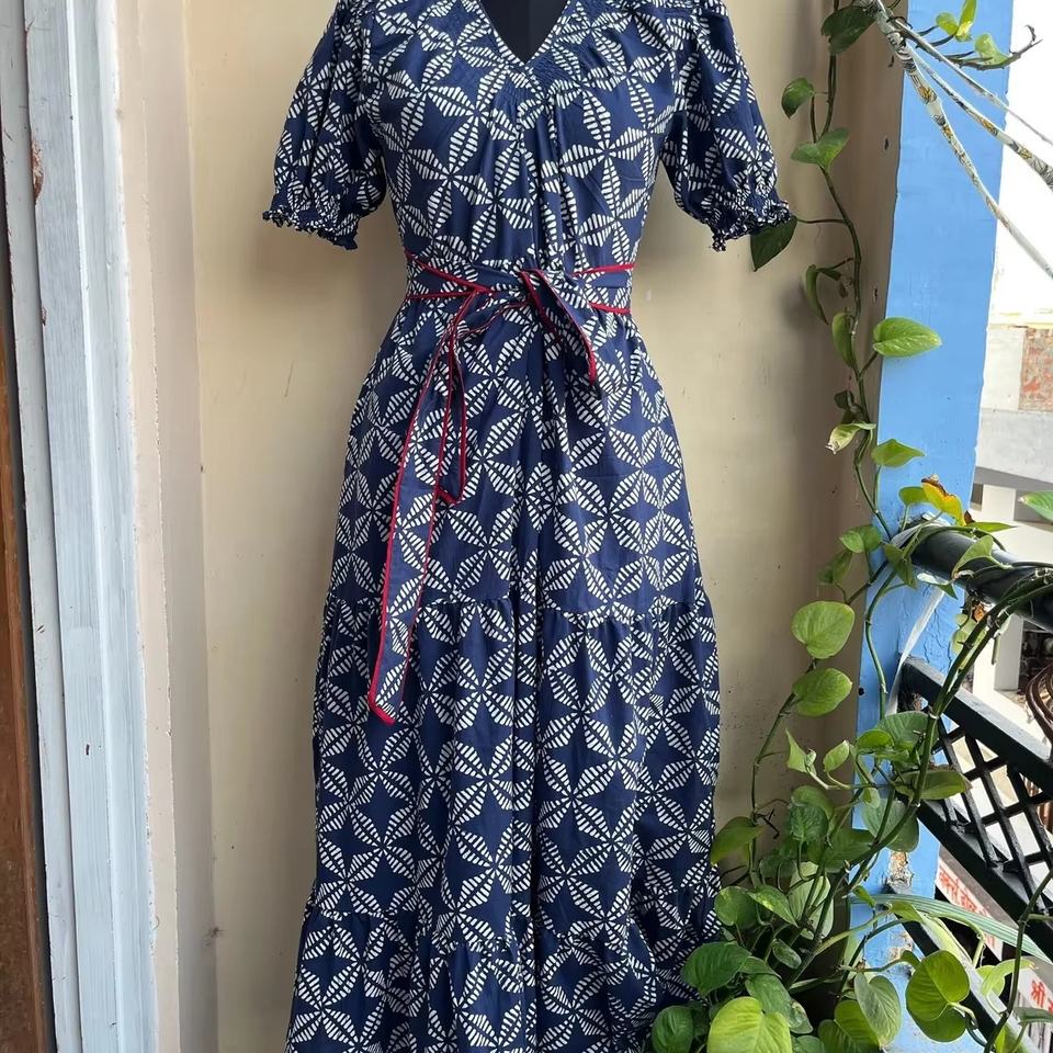 เดรสยาวแม็กซี่ผ้าฝ้ายอินเดียแท้ 100% ลายดอกพิมพ์ลายบล็อกด้วยมือ ขายดี สำหรับผู้หญิง แต่งลายปัก สไตล์ลำลอง