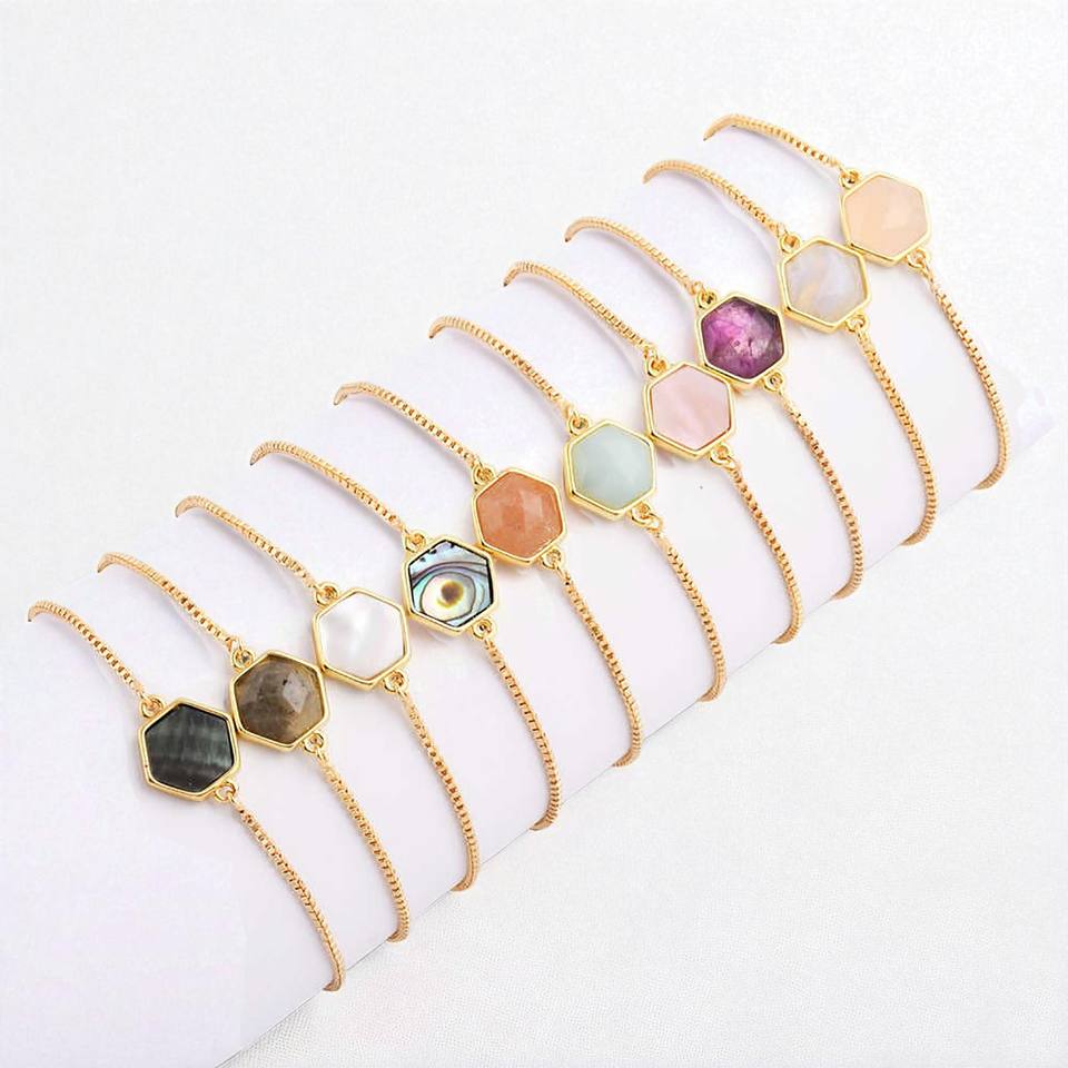 กำไลข้อมือแบบโซ่เชื่อมต่อกับเครื่องประดับสำหรับกลุ่มหินนำโชคพลอยทานตะวันทรงหกเหลี่ยม