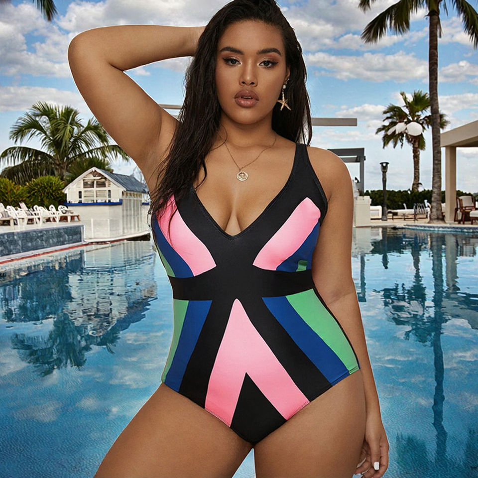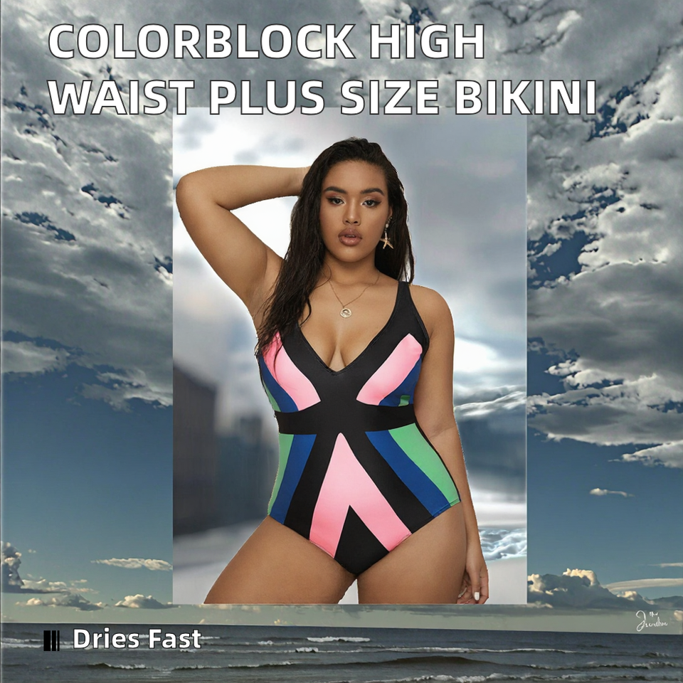 ชุดว่ายน้ำบิกินี่เอวสูงขายดี ไซส์ใหญ่ ลายพิมพ์สีสันตัดกัน ชุดวันพีซ 2 ชิ้น