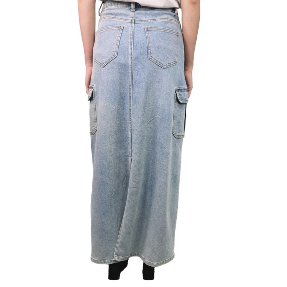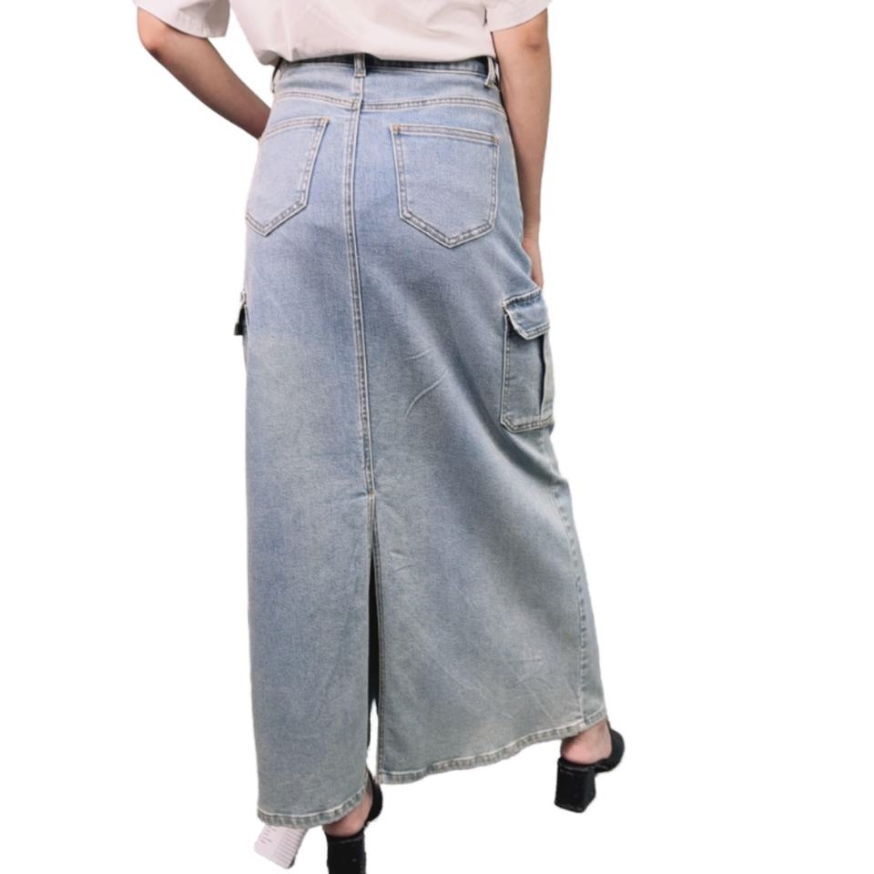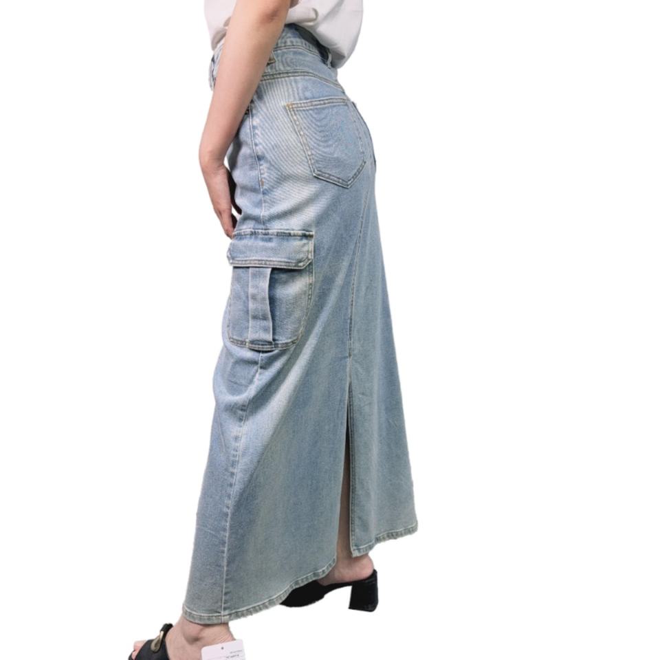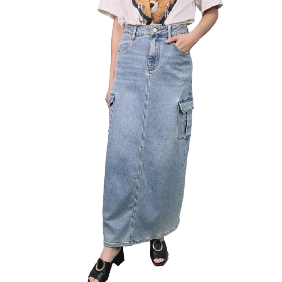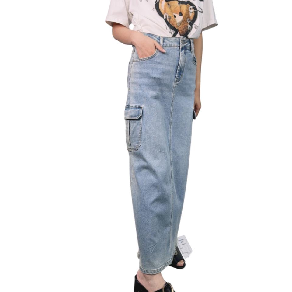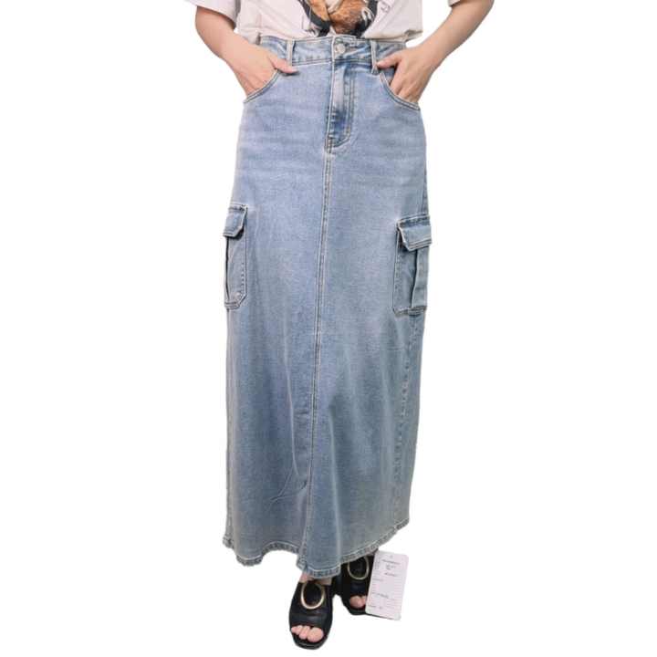 กระโปรงยีนส์เอวสูงสีพื้นผ้าฝ้ายมีกระเป๋า สไตล์ลำลองสำหรับผู้หญิง ขายดี