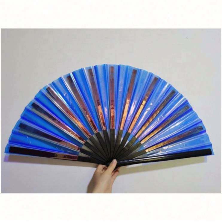 พัดมือไม้ไผ่ PVC สะท้อนแสงโฮโลแกรมสีรุ้งขนาดใหญ่ ขายดี สำหรับงานเทศกาลดนตรี งานแต่งงาน งานเต้นรำ การแสดง และเป็นของขวัญ