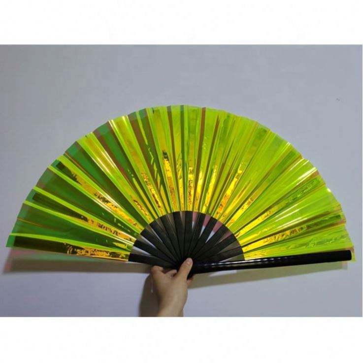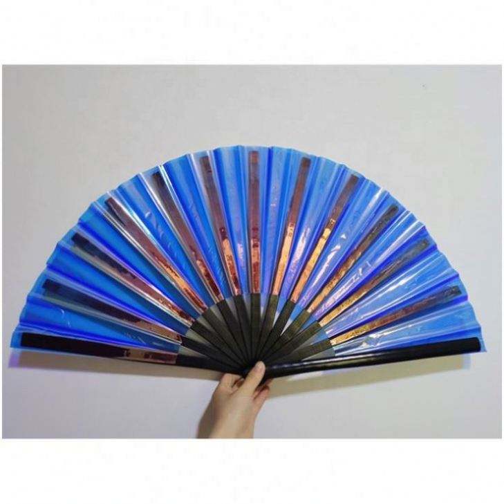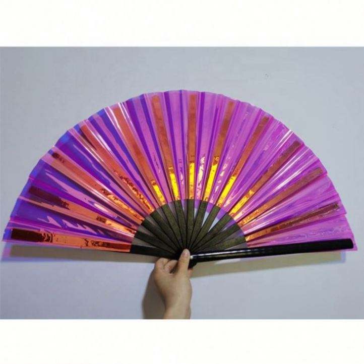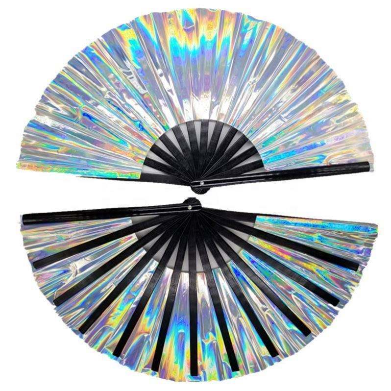 พัดมือไม้ไผ่ PVC สะท้อนแสงโฮโลแกรมสีรุ้งขนาดใหญ่ ขายดี สำหรับงานเทศกาลดนตรี งานแต่งงาน งานเต้นรำ การแสดง และเป็นของขวัญ