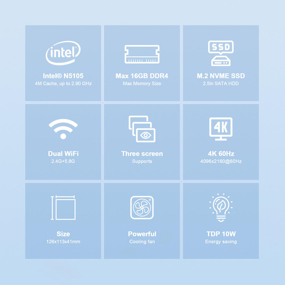 Intel N5105 4core โฮสต์คอมพิวเตอร์ขนาดเล็กเชิงพาณิชย์ขนาดเล็กไร้สายขนาดเล็กสำหรับบ้านแบบพกพาที่ไม่มีพัดลมมินิพีซี