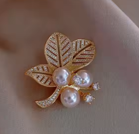 เข็มกลัดรูปใบไม้ประดับมุกและคริสตัล สไตล์เกาหลีสุดฮิต งานดีไซน์ย้อนยุค หรูหรา ชุบทอง สำหรับงานแต่งงาน งานหมั้น และงานเลี้ยง
