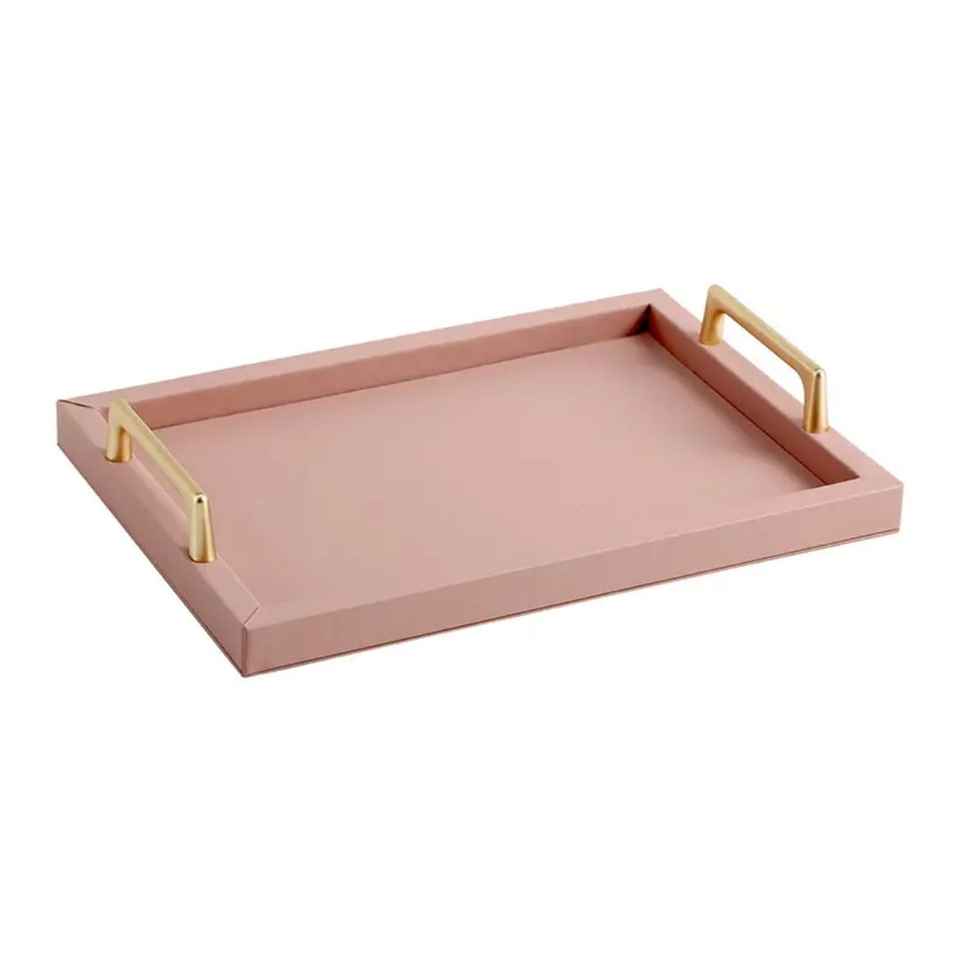 ถาดเสิร์ฟทรงสี่เหลี่ยมทำด้วยมือสุดหรูถาดอาหารเช้าทำจากไม้หนังหรูหราพร้อมที่จับโลหะสำหรับอาหารและของตกแต่งบ้าน