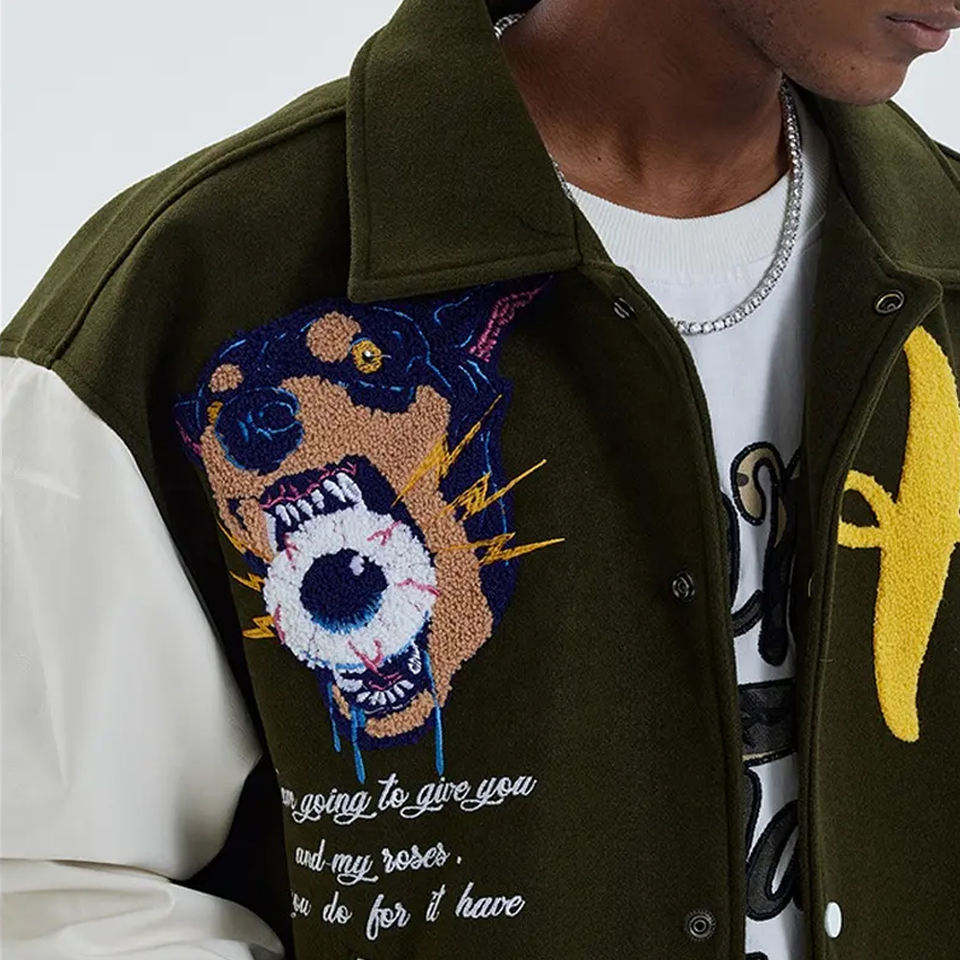 แจ็คเก็ตวาร์ซิตี้ผู้ชายไซส์ใหญ่แบบกำหนดเองขายดี พร้อมปกตั้ง โลโก้ด้านหน้า แขนหนังแกะ ปักลายเชนิลล์ สำหรับฤดูหนาว