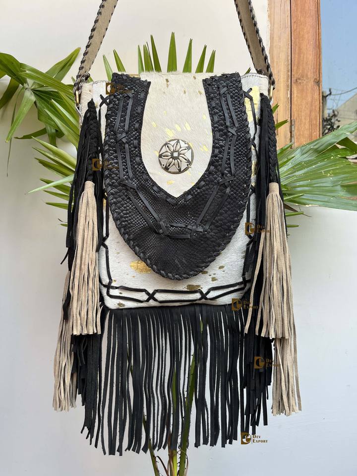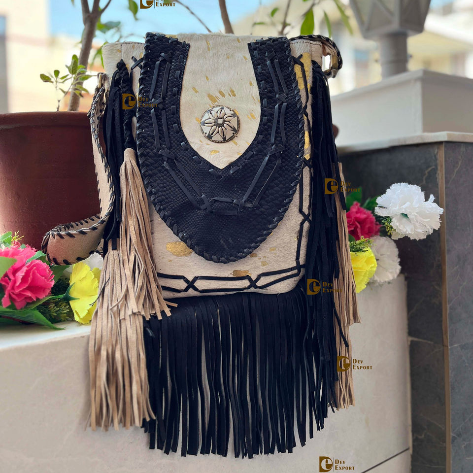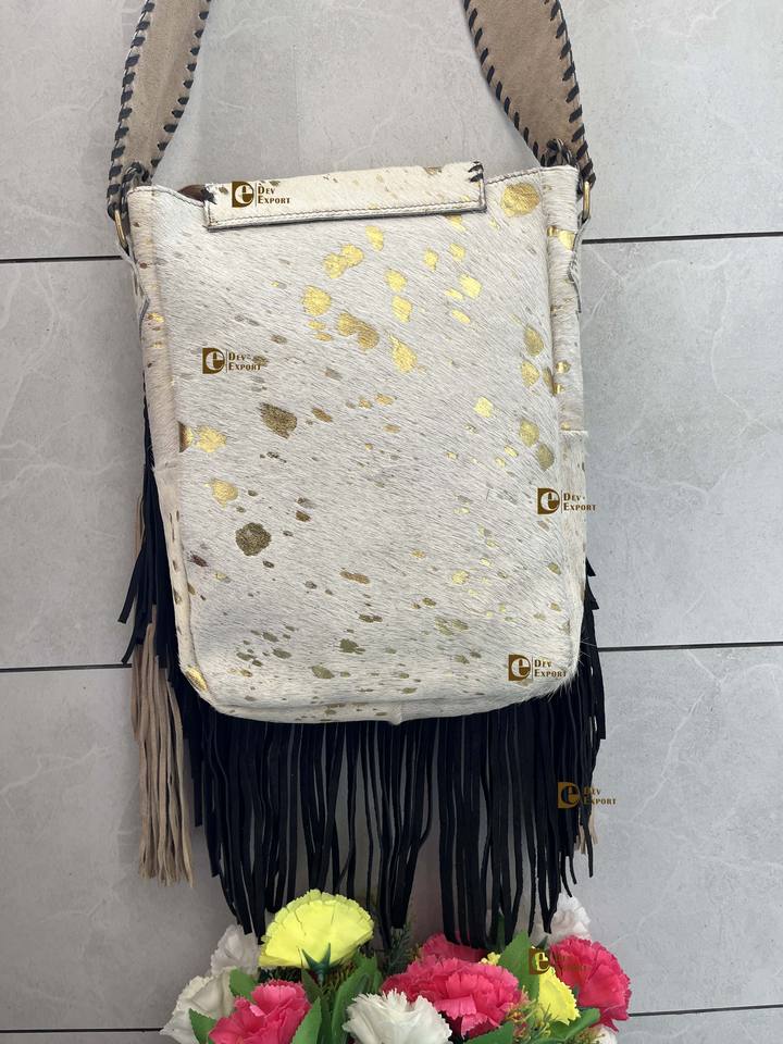 กระเป๋าถือผู้หญิงสไตล์โบฮีเมียนน้ำหนักเบาดีไซน์ใหม่หนังวัวแท้ขนโลหะมีตัวอักษรพู่