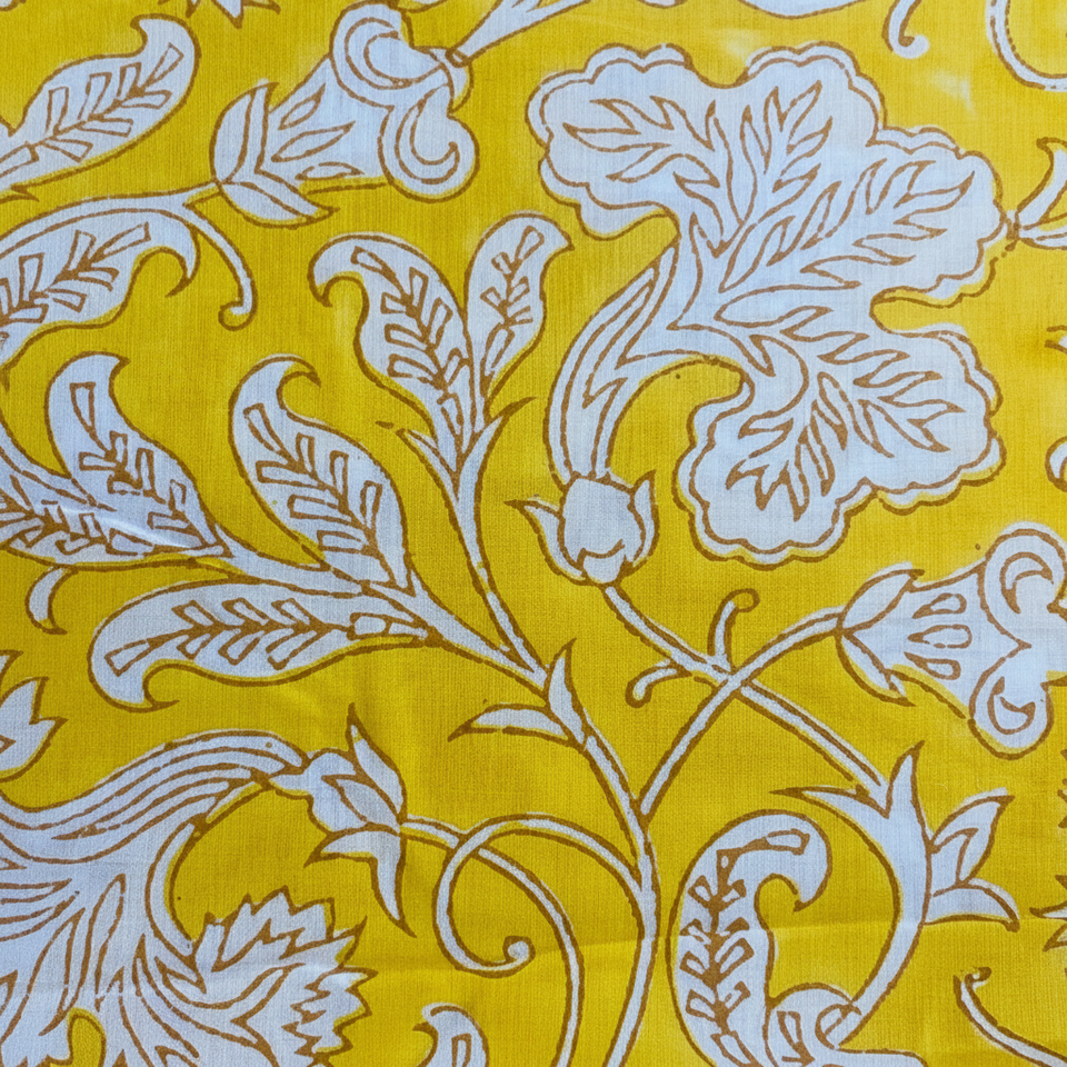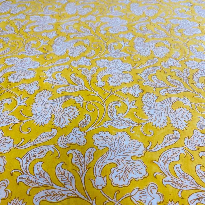 ผ้าม่านพิมพ์ลายดอกไม้ทำจากผ้าฝ้าย100% สีเหลืองและสีขาวสำหรับผู้หญิงผ้าแซฟฟรอนพิมพ์ลายบล็อกลายดอกไม้สุดหรูจากอินเดียน
